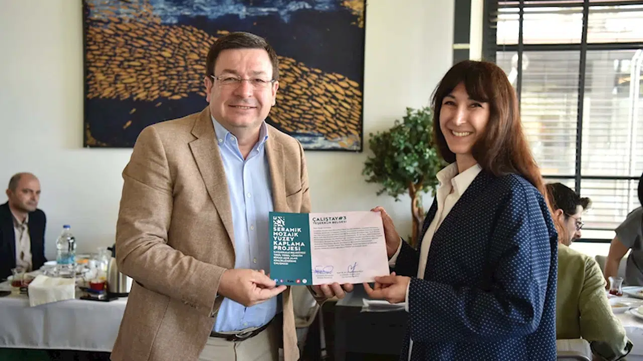 ÇANAKKALE, (DHA)-ÇANAKKALE Belediyesi, Çanakkale Onsekiz Mart Üniversitesi (Güzel Sanatlar Fakültesi, Çanakkale Seramikleri Araştırma Geliştirme ve Uygulama Merkezi) ile Kaleseramik Çanakkale Kalebodur Seramik San. A.Ş. iş birliğinde, Çanakkale Belediyesi Yeşil Yerel Yönetim Binası Açık Alan Kimliklendirme çalışması kapsamında hayata geçirilen ileri dönüşüm projesi Seramik Mozaik Yüzey Kaplama Projesi'nin 3’üncü çalıştayına katılan öğretim görevlileri ve öğrenciler ile proje paydaşları, düzenlenen etkinlikte bir araya geldi.