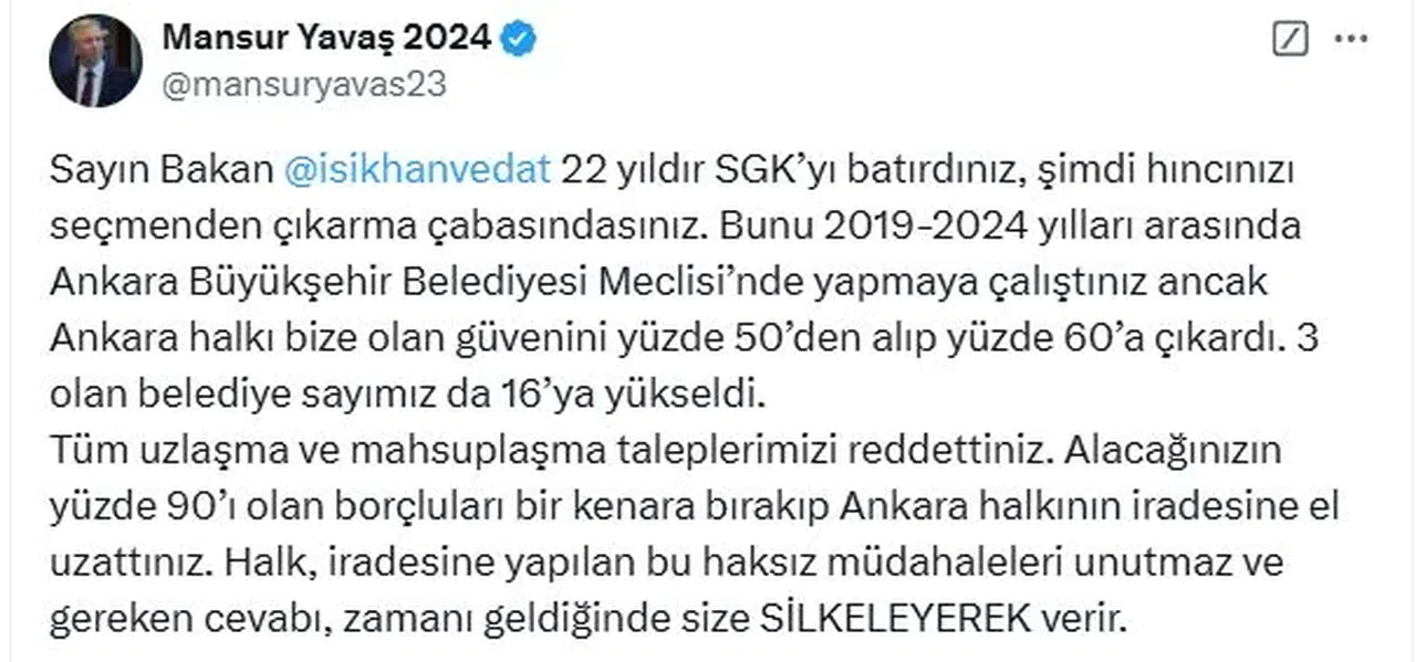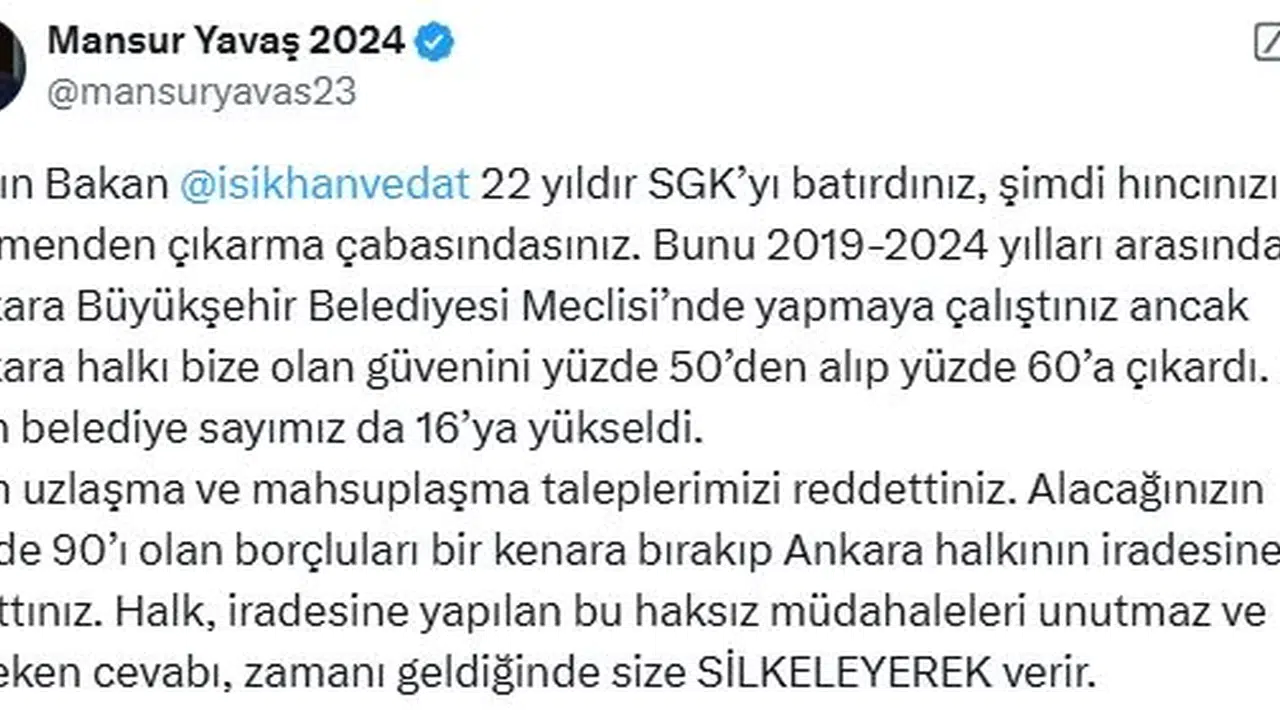 Ankara Büyükşehir Belediye Başkanı Mansur Yavaş, sosyal medya hesabından bir açıklama daha yaptı. Yavaş, "Sayın Bakan Vedat Işıkhan 22 yıldır SGK'yı batırdınız, şimdi hıncınızı seçmenden çıkarma çabasındasınız. Bunu 2019-2024 yılları arasında Ankara Büyükşehir Belediyesi Meclisi’nde yapmaya çalıştınız ancak Ankara halkı bize olan güvenini yüzde 50’den alıp yüzde 60’a çıkardı. 3 olan belediye sayımız da 16’ya yükseldi. Tüm uzlaşma ve mahsuplaşma taleplerimizi reddettiniz. Alacağınızın yüzde 90’ı olan borçluları bir kenara bırakıp Ankara halkının iradesine el uzattınız. Halk, iradesine yapılan bu haksız müdahaleleri unutmaz ve gereken cevabı, zamanı geldiğinde size silkeleyerek verir" dedi. (DHA)