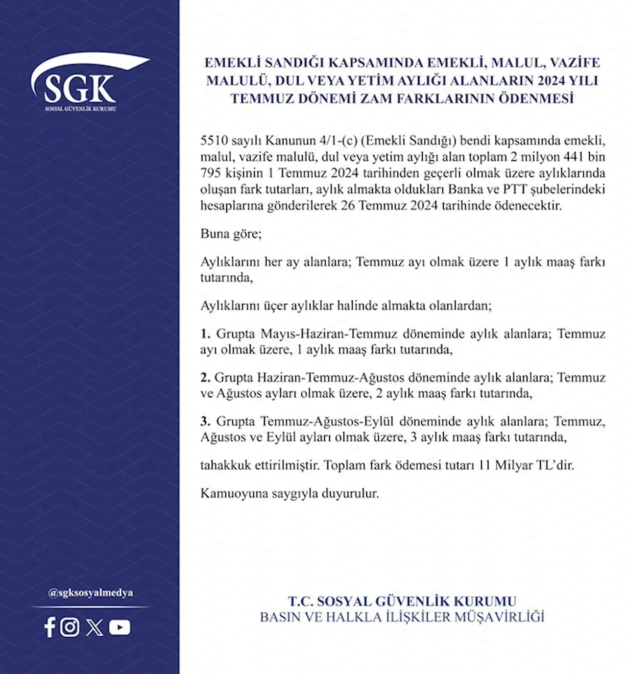 SGK'nın sosyal medya hesabından yapılan açıklamada, "5510 sayılı Kanun'un 4/1-(c) (Emekli Sandığı) bendi kapsamında emekli, malul, vazife malulü, dul veya yetim aylığı alan toplam 2 milyon 441 bin 795 kişinin, 1 Temmuz 2024 tarihinden geçerli olmak üzere aylıklarında oluşan fark tutarları, aylık almakta oldukları banka ve PTT şubelerindeki hesaplarına gönderilerek 26 Temmuz 2024 tarihinde ödenecektir" denildi.