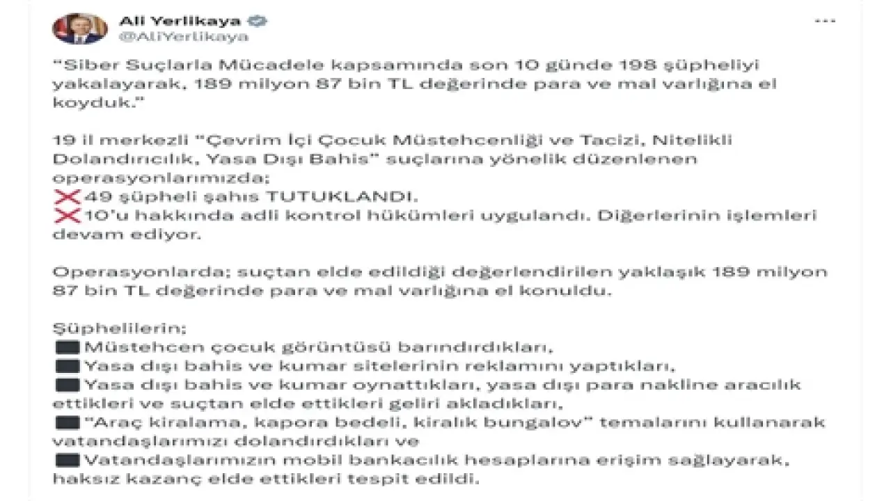 Bakan Yerlikaya, sosyal medya hesabından yaptığı açıklamada, siber suçlarla mücadele kapsamında son 10 günde 198 şüpheliyi yakaladıklarını belirterek, "19 il merkezli 'çevrim içi çocuk müstehcenliği ve tacizi, nitelikli dolandırıcılık, yasa dışı bahis' suçlarına yönelik düzenlenen operasyonlarımızda; 49 şüpheli şahıs tutuklandı. 10'u hakkında adli kontrol hükümleri uygulandı. Diğerlerinin işlemleri devam ediyor. Operasyonlarda; suçtan elde edildiği değerlendirilen yaklaşık 189 milyon 87 bin TL değerinde para ve mal varlığına el konuldu. Şüphelilerin; müstehcen çocuk görüntüsü barındırdıkları, yasa dışı bahis ve kumar sitelerinin reklamını yaptıkları, yasa dışı bahis ve kumar oynattıkları, yasa dışı para nakline aracılık ettikleri ve suçtan elde ettikleri geliri akladıkları, 'araç kiralama, kapora bedeli, kiralık bungalov' temalarını kullanarak vatandaşlarımızı dolandırdıkları ve vatandaşlarımızın mobil bankacılık hesaplarına erişim sağlayarak, haksız kazanç elde ettikleri tespit edildi" dedi.