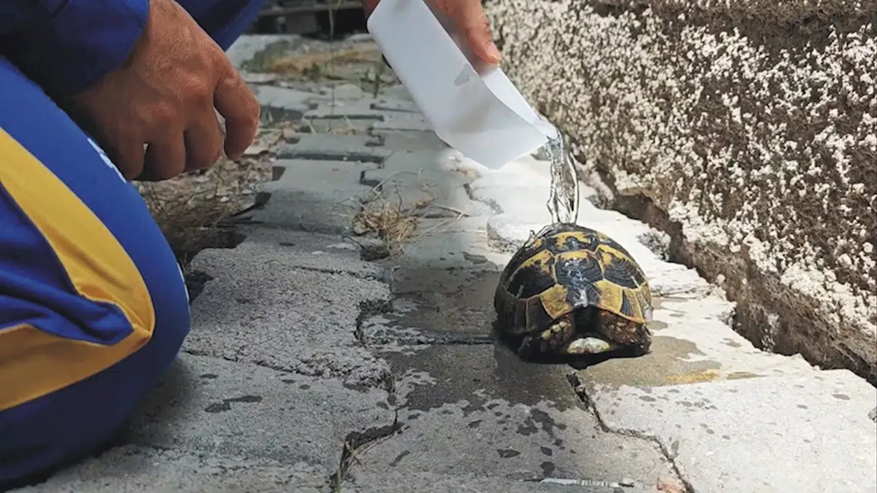 Sıcağa maruz kalan kaplumbağa suyla serinletildi, muayene edilip doğaya salındı
