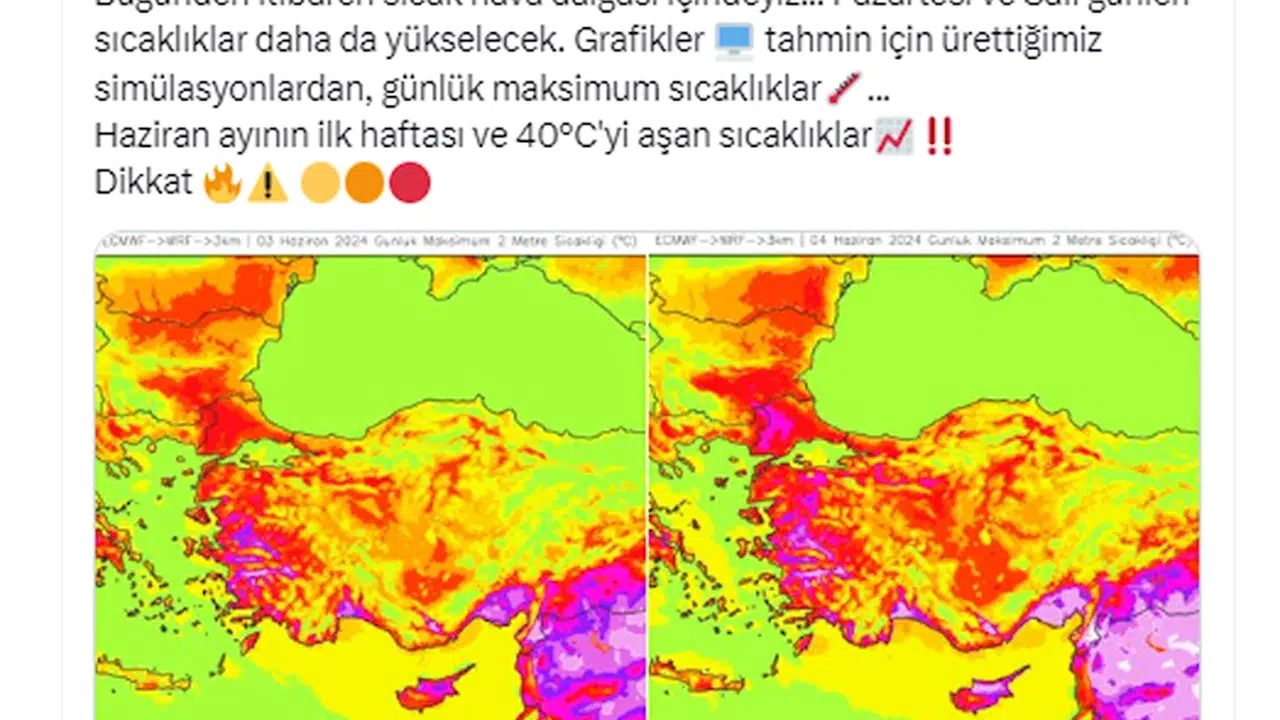 “Bugünden itibaren sıcak hava dalgası içindeyiz. Pazartesi ve salı günleri sıcaklıklar daha da yükselecek. Grafikler tahmin için ürettiğimiz simülasyonlardan, günlük maksimum sıcaklıklar. Haziran ayının ilk haftası ve 40 dereceyi aşan sıcaklıklar. Sıcak günler bitti, çok daha sıcak günler kapıda. Kıpkırmızı gezegen." (DHA)