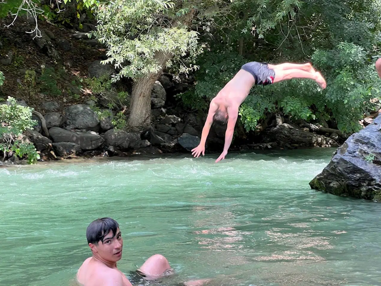Derede yüzen Bedirhan Ata (23), "Sıcak havada bunalanlar, Dağlıca bölgesine, gelip buradaki serin suda yüzüyor. Ben de arkadaşlarımla buraya hem piknik yapmaya hem yüzmeye geldim. Soğuk suda yüzmek de ayrı bir zevk. Arkadaşlarımızla hem yüzüyoruz hem eğleniyoruz" dedi. (DHA)