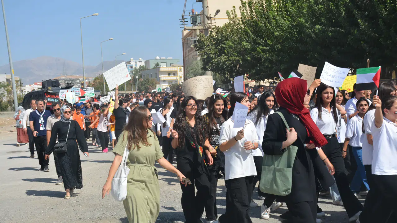 Silopi ilçesinde Hacı Mehmet Ökten Anadolu İmam Hatip Lisesi'nin öncülüğünde, yaklaşık 2 bin öğrencinin katılımıyla ‘Filistin’e destek’ yürüyüşü düzenlendi. Hacı Mehmet Ökten Camii önünde başlayan yürüyüşe İlçe Milli Eğitim Müdürü Murat Bilen, okul müdürleri, öğretmenler ve öğrenciler katıldı. Öğrenciler, yürüyüşte döviz ve pankartlar taşıdı, sık sık ‘Kahrolsun İsrail’ ve ‘Filistin Halkı Yalnız Değildir’ sloganları attı.
