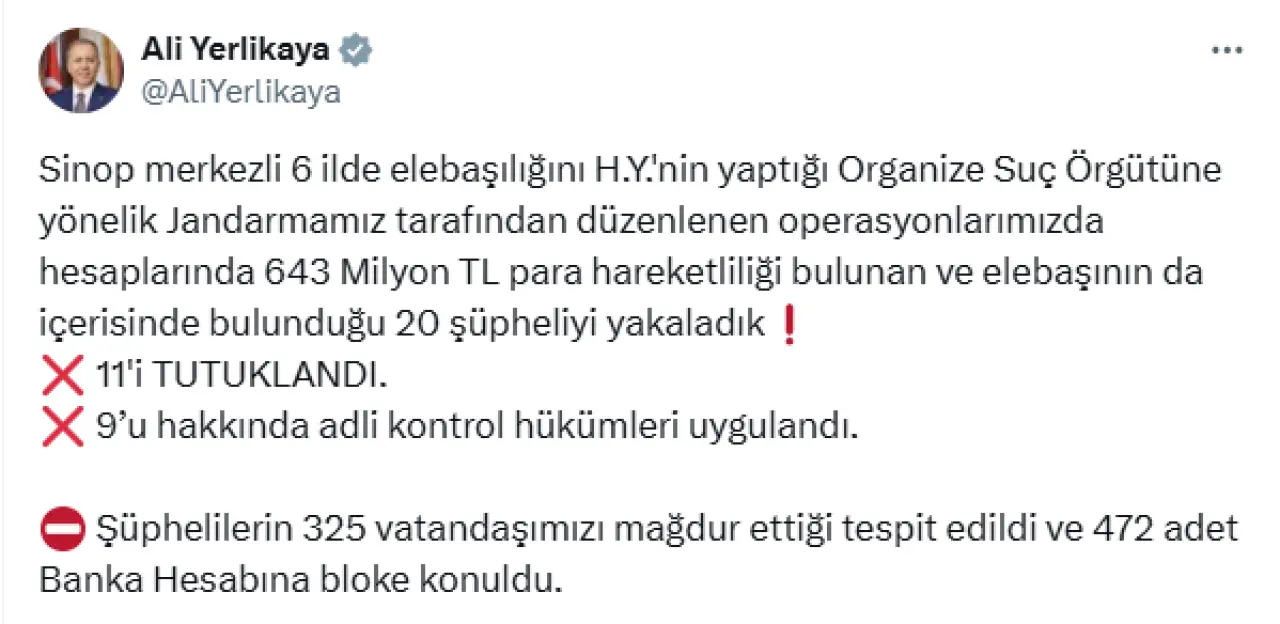 İçişleri Bakanı Ali Yerlikaya, jandarma tarafından düzenlenen suç örgütü operasyonunu sosyal medya hesabından paylaştı. Buna göre; Sinop merkezli 6 ilde elebaşılığını H.Y.'nin yaptığı organize suç örgütüne yönelik düzenlenen operasyonda hesaplarında 643 milyon TL para hareketliliği bulunan ve elebaşının da içerisinde bulunduğu 20 şüpheli yakalandı. Şüphelilerden 11'i çıkarıldığı hakimlikçe tutuklandı, 9'u hakkında adli kontrol hükümleri uygulandı. Şüphelilerin 325 vatandaşı mağdur ettiği tespit edildi ve 472 banka hesabına bloke konuldu.