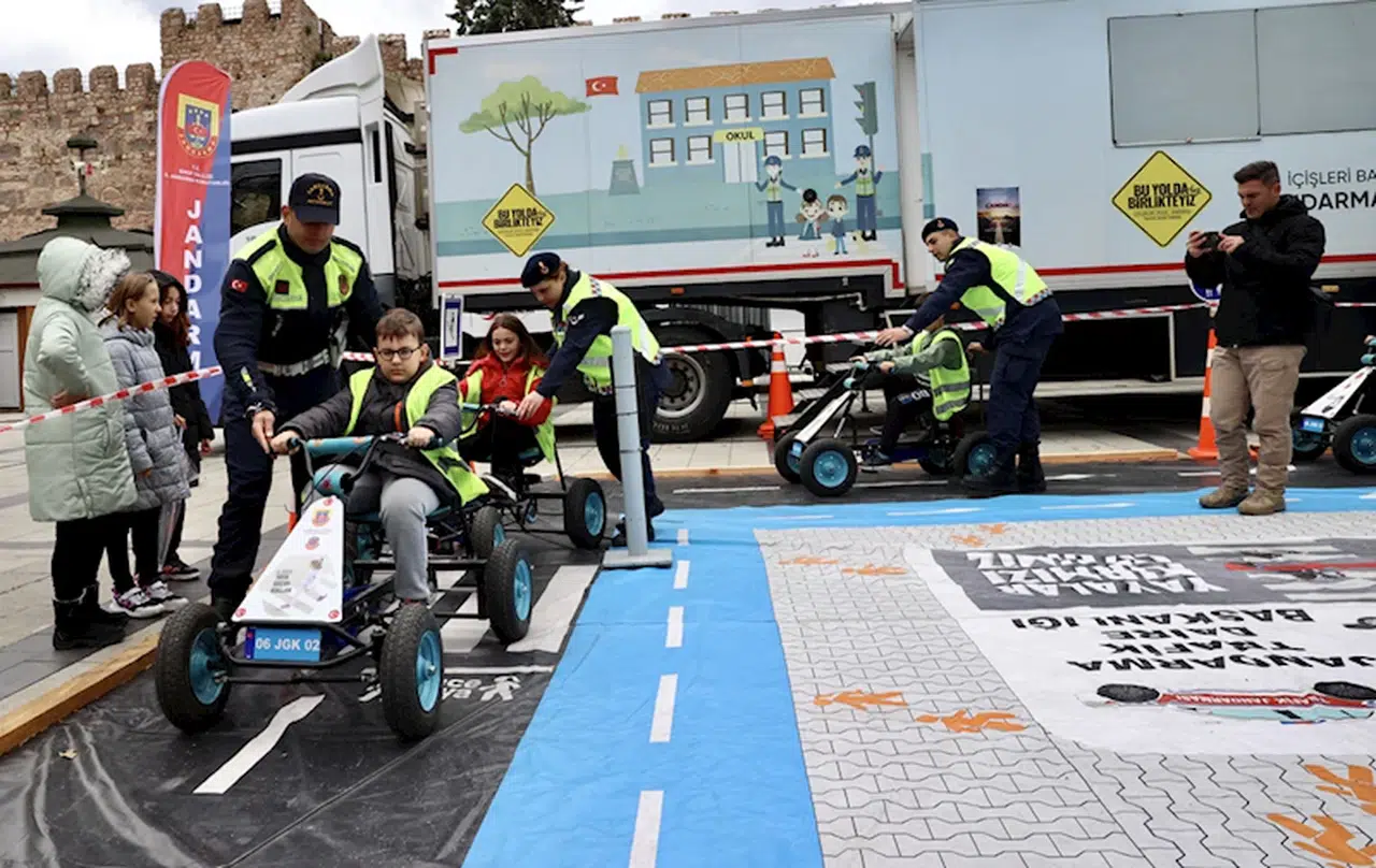 Burada görevli jandarma ekiplerince kurulan parkurda öğrencilere akülü ve pedallı arabalarla uygulamalı eğitim verildi. Gruplar halinde eğitim tırına da alınan öğrencilere trafik simülasyonu izletilip broşür dağıtıldı.