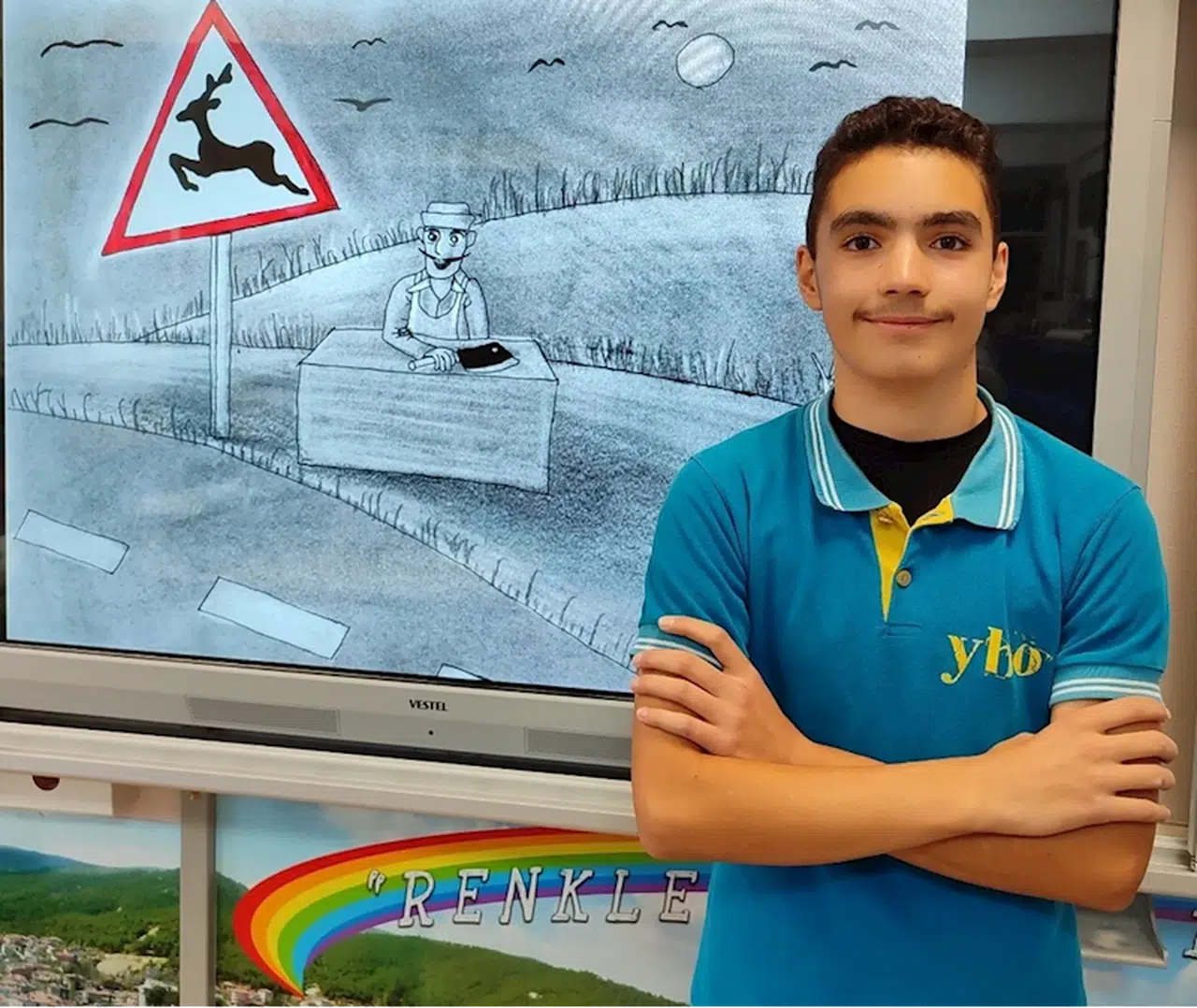 Boyabat Yaşar Topçu Yatılı Bölge Ortaokulu 8'inci sınıf öğrencisi Fatih Dursun, hayvan haklarına dikkati çektiği karikatürüyle Belçika'da bu yıl 36'ncısı düzenlenen Uluslararası Olense Karikatür Yarışması'na başvurdu.