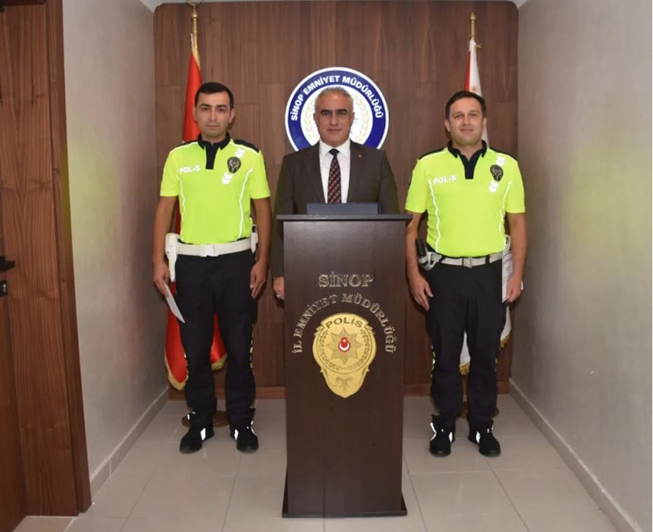 İlçenin sahilinde yürüyüş yaptığı sırada Şahin Tepesi mevkisinde mahsur kalan 88 yaşındaki Celal Bayrak’ı kayalık alanda sırtlarında taşıyarak kurtaran polis memurları Emre Türkmen ve Bayram Aydın'ı, İl Emniyet Müdürü Tarıkhan Çetiner makamında ağırladı.