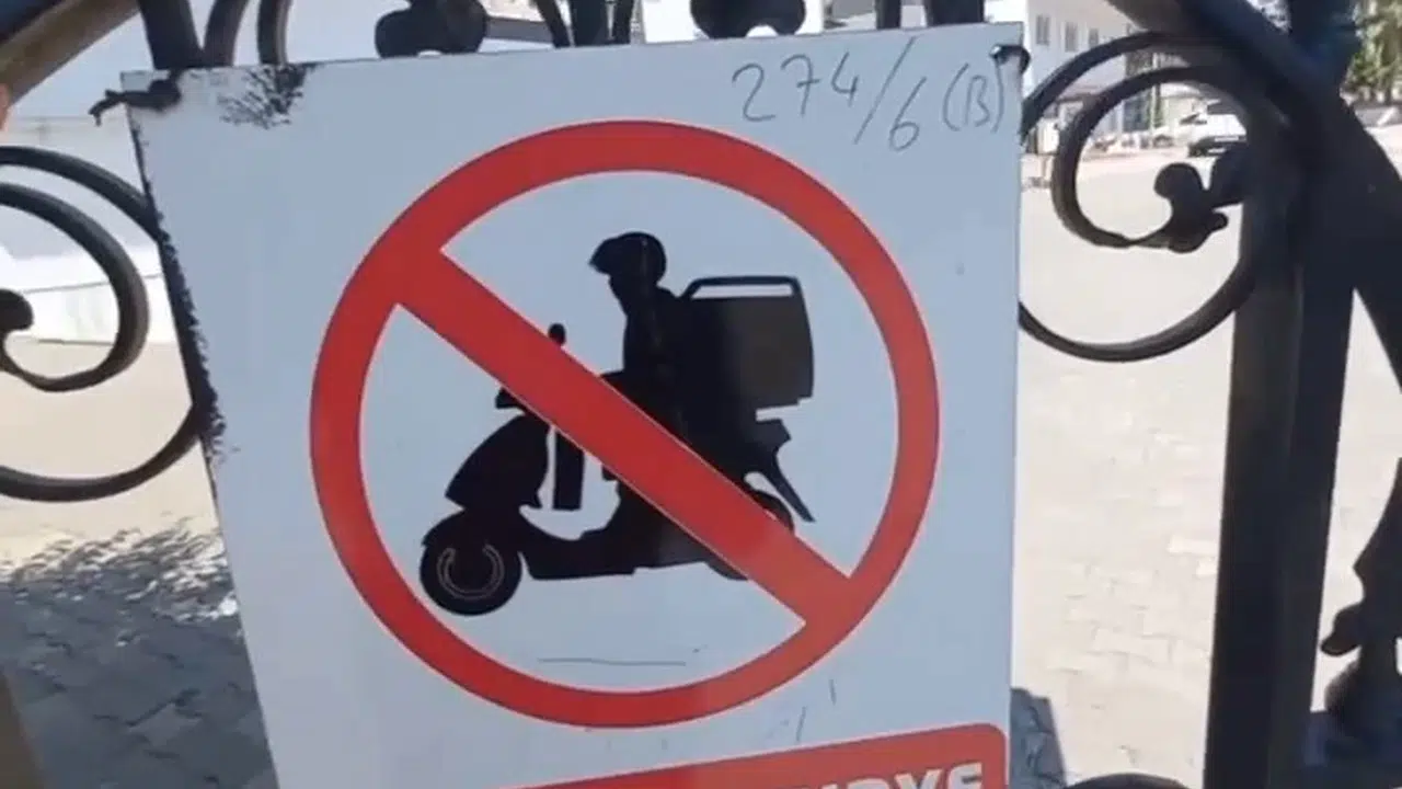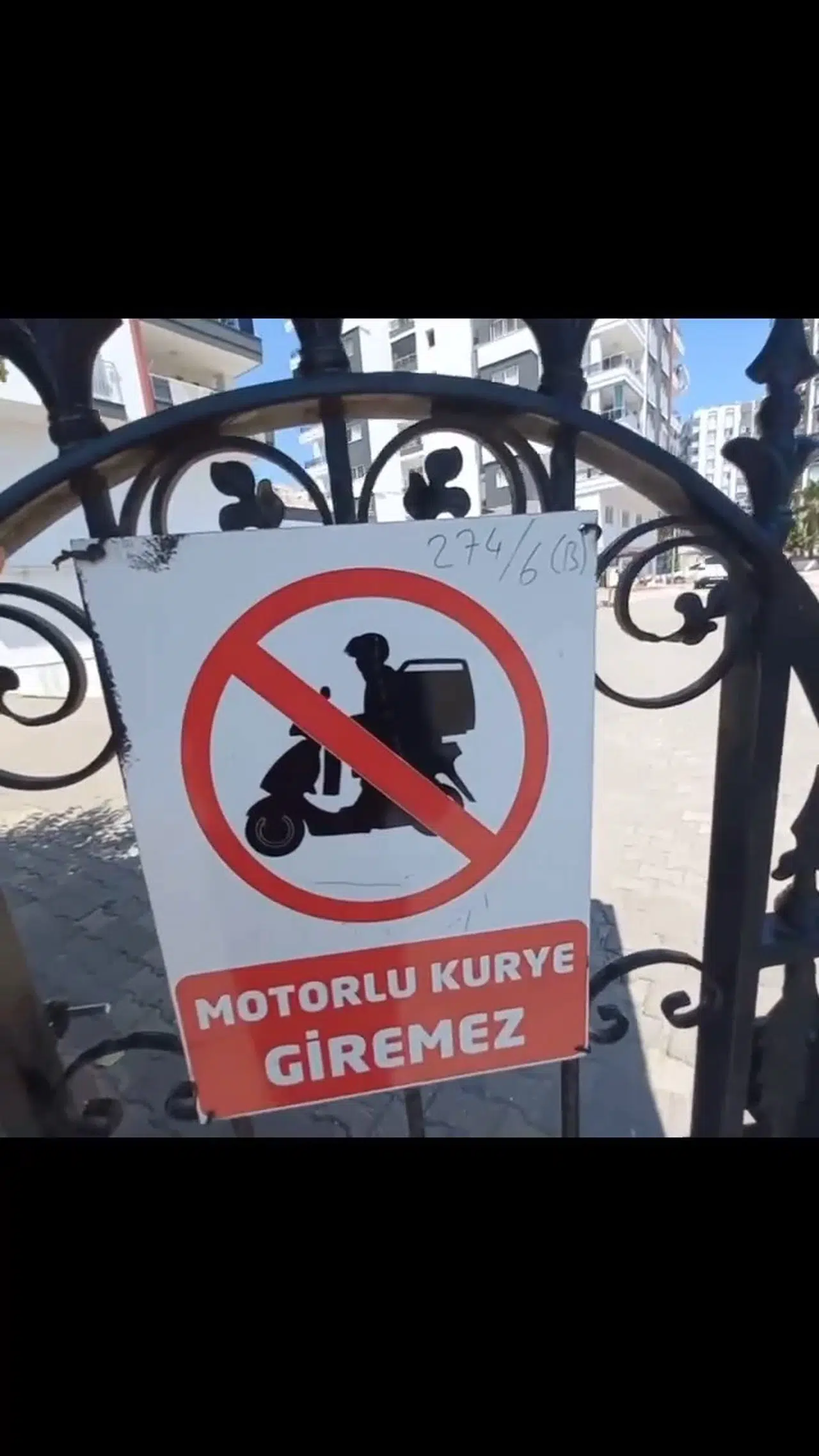 ADANA, (DHA)- ADANA'da sipariş götürdüğü sitenin kapısındaki 'Motorlu kurye giremez' yazılı levhaya tepki gösteren motosikletli kurye Yalçın Parmak, cep telefonuyla görüntü çekerek, "Bu yazıyı kaldırın. Bugün 14 Ağustos. 16 Ağustos'ta bu yazı burada durursa kapıyı komple söker götürürüm. 'Motosiklet' diye yazman lazım buraya" dediği anları sosyal medyada paylaşıp site yönetimini uyardı.