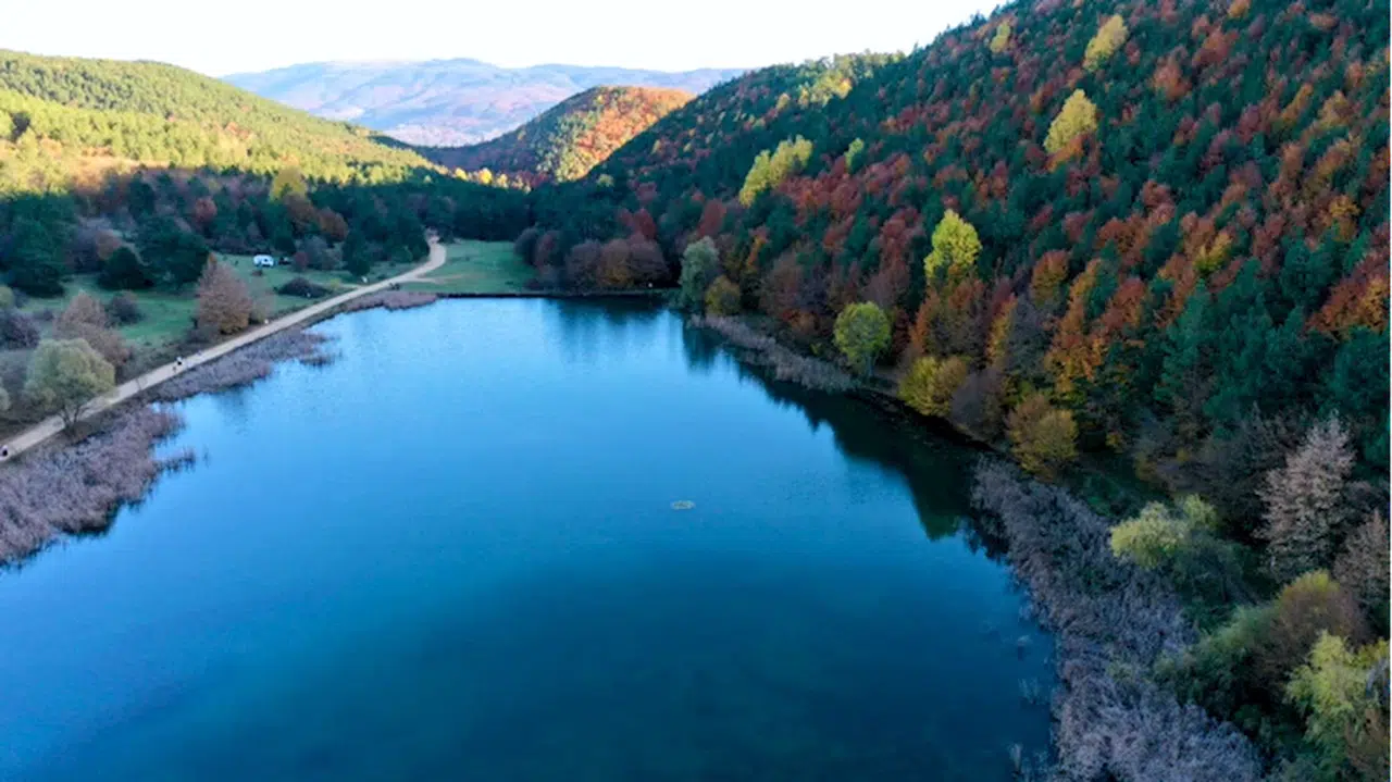 Göletin bulunduğu alandaki sonbahar manzaraları havadan da görüntülendi.