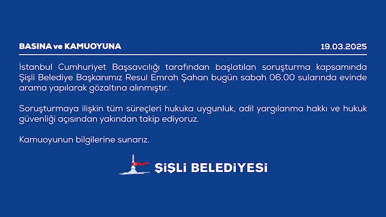 "İstanbul Cumhuriyet Başsavcılığı tarafından başlatılan soruşturma kapsamında Şişli Belediye Başkanımız Resul Emrah Şahan, bugün saat 06.00 sularında evinde arama yapılarak gözaltına alınmıştır. Soruşturmaya ilişkin tüm süreçleri hukuka uygunluk, adil yargılanma hakkı ve hukuk güvenliği açısından yakından takip ediyoruz."