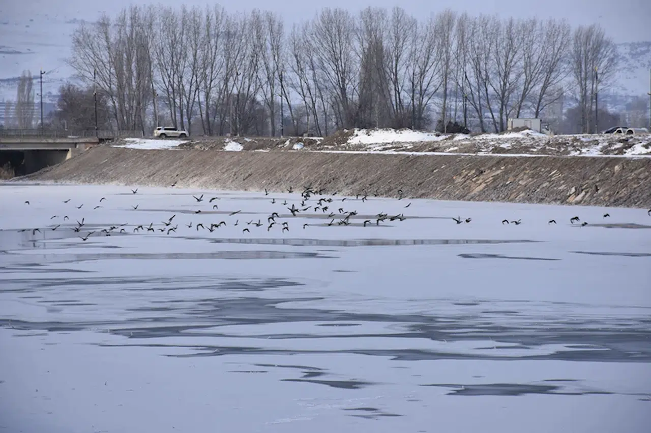 1355 kilometre ile Türkiye'nin en uzun nehri olan Kızılırmak'ın Sivas kent merkezinden geçen bölümlerinin büyük bölümünün buzla kaplandığı görüldü. Soğuk havanın etkisi ile nehirde su akışının zayıf olduğu bölümlerin yüzeyi buz tuttu. Tarihi Eğri Köprü civarındaki bölümlerde nehrin yüzeyi buz pistini andırdı. Meteoroloji verilerine göre; kentte soğuk hava dalgasının gelecek hafta da etkisini sürdürmesi bekleniyor. (DHA)