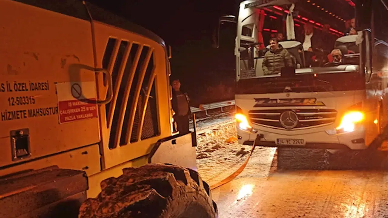 Sivas’ta kar yağışı ve buzlanma nedeni ile ulaşımda sıkıntılar yaşandı. Gece saatlerinde Malatya-Kayseri kara yolu üzerinde Gürün ilçesi yakınlarında kar ve buzlanma nedeniyle yolda kalan araçlar oldu. Bunun üzerine harekete geçen Sivas İl Özel İdare Müdürlüğü ekipleri güzergah üzerinde mahsur kalan 80 binek araç ile 4 otobüs ve 6 TIR'ı kurtardı. İlerlemekte güçlük çeken araçlar iş makinesine bağlanan halatlar ile çekilerek mahsur kaldıkları yerden çıkarıldı. (DHA)