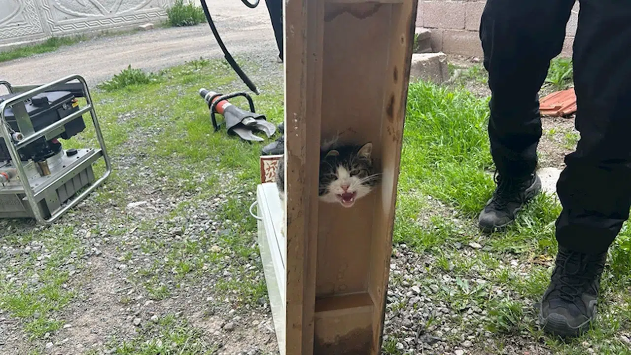 Sivas'ta kafası dolaba sıkışan kediyi itfaiye kurtardı