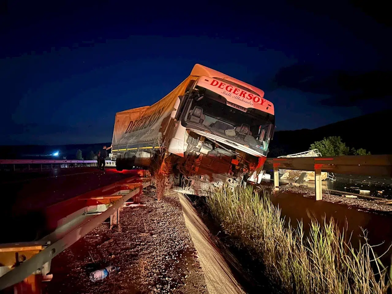 Uğur YİĞİT/ SİVAS, (DHA)- SİVAS'ta sürücüsünün kontrolünden çıkan TIR’ın bariyerlere çarpması sonucu dorsesinde yüklü bulunan 25 ton suni gübre ve dezenfektan malzemesi yola saçıldı.