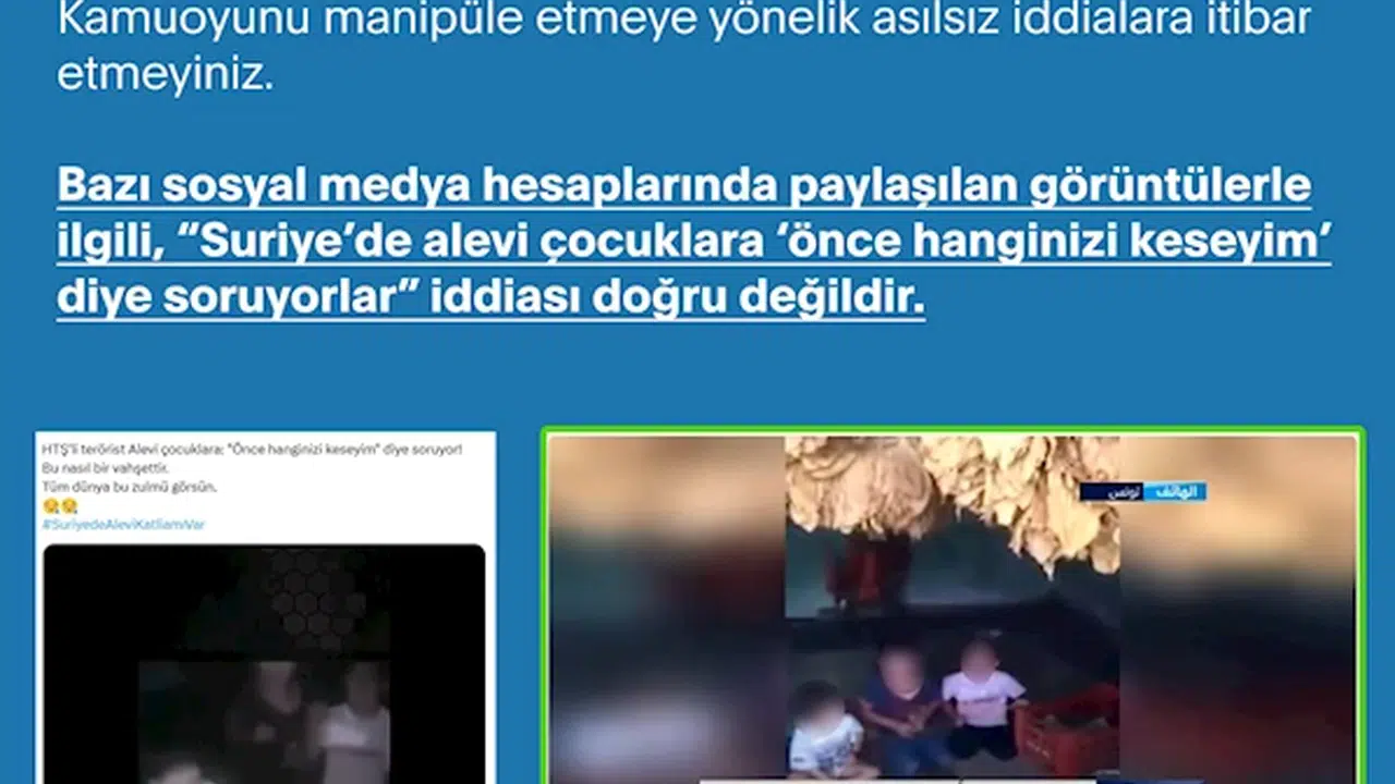 ANKARA, (DHA)- CUMHURBAŞKANLIĞI İletişim Başkanlığı Dezenformasyonla Mücadele Merkezi (DMM) tarafından, Suriye'de çekildiği iddia edilen Alevi çocuklarla ilgili sosyal medyada yer alan videonun gerçeği yansıtmadığı açıklandı.