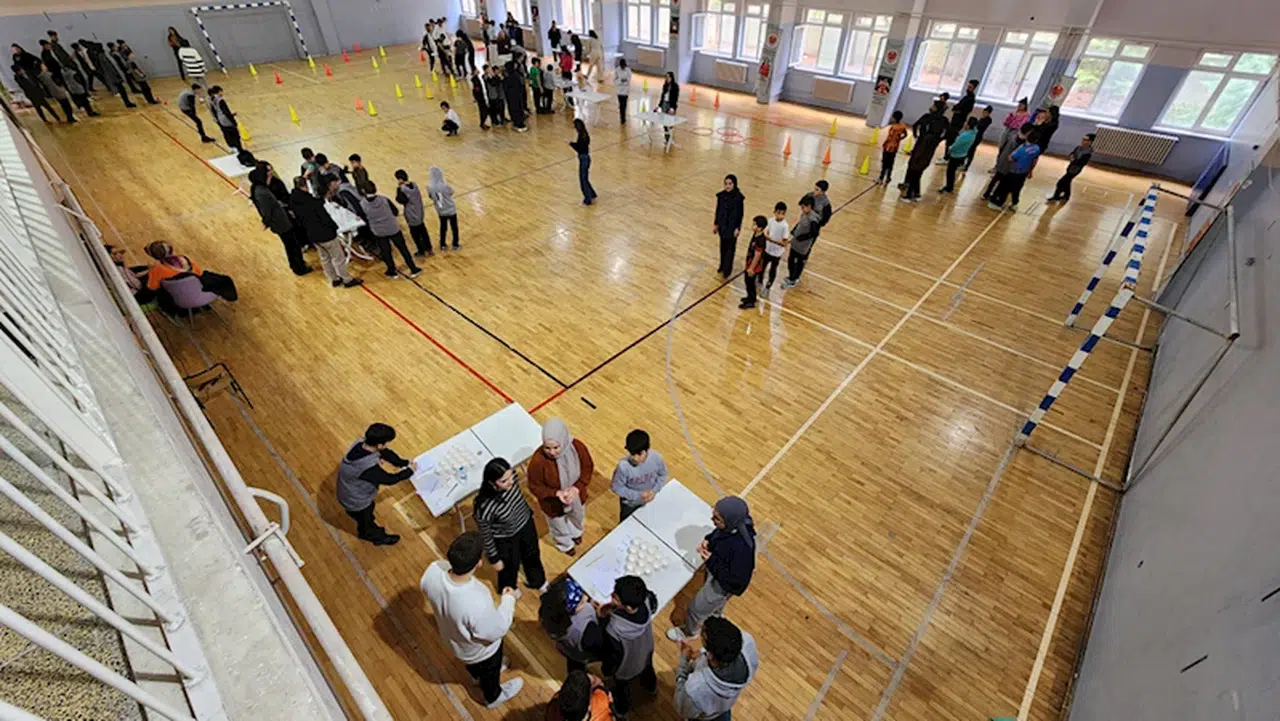 Okulun spor salonunda düzenlenen etkinlikte üniversite ile ortaokul öğrencileri, spor salonunda oluşturulan altı parkurda eğlenceli matematik oyunları oynadı.