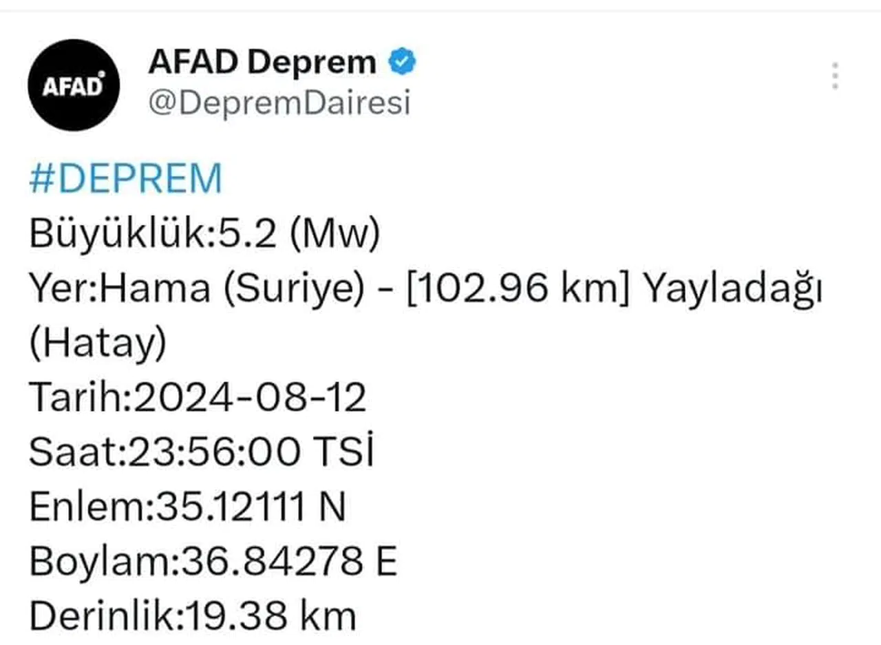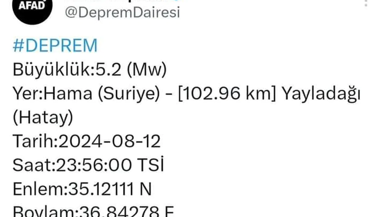 Afet ve Acil Durum Yöhetimi Başkanlığı (AFAD) verilerine göre Suriye Hama kentinde saat 23.55’te 5.2 büyüklüğünde deprem kaydedildi. Deprem merkez üssüne 107 kilometre mesafede bulunan Hatay’ın yayladağı ilçesi ile kent genelinde de hissedildi. Yerin 19 kilometre derinliğinde meydana gelen depremle birlikte Hatay ve ilçelerinde bazı vatandaşlar sokaklara çıktı. Depremde ilk belirlemelere göre Türkiye sınırları içerisinde herhangi bir olumsuzluk yaşanmadı. (DHA)