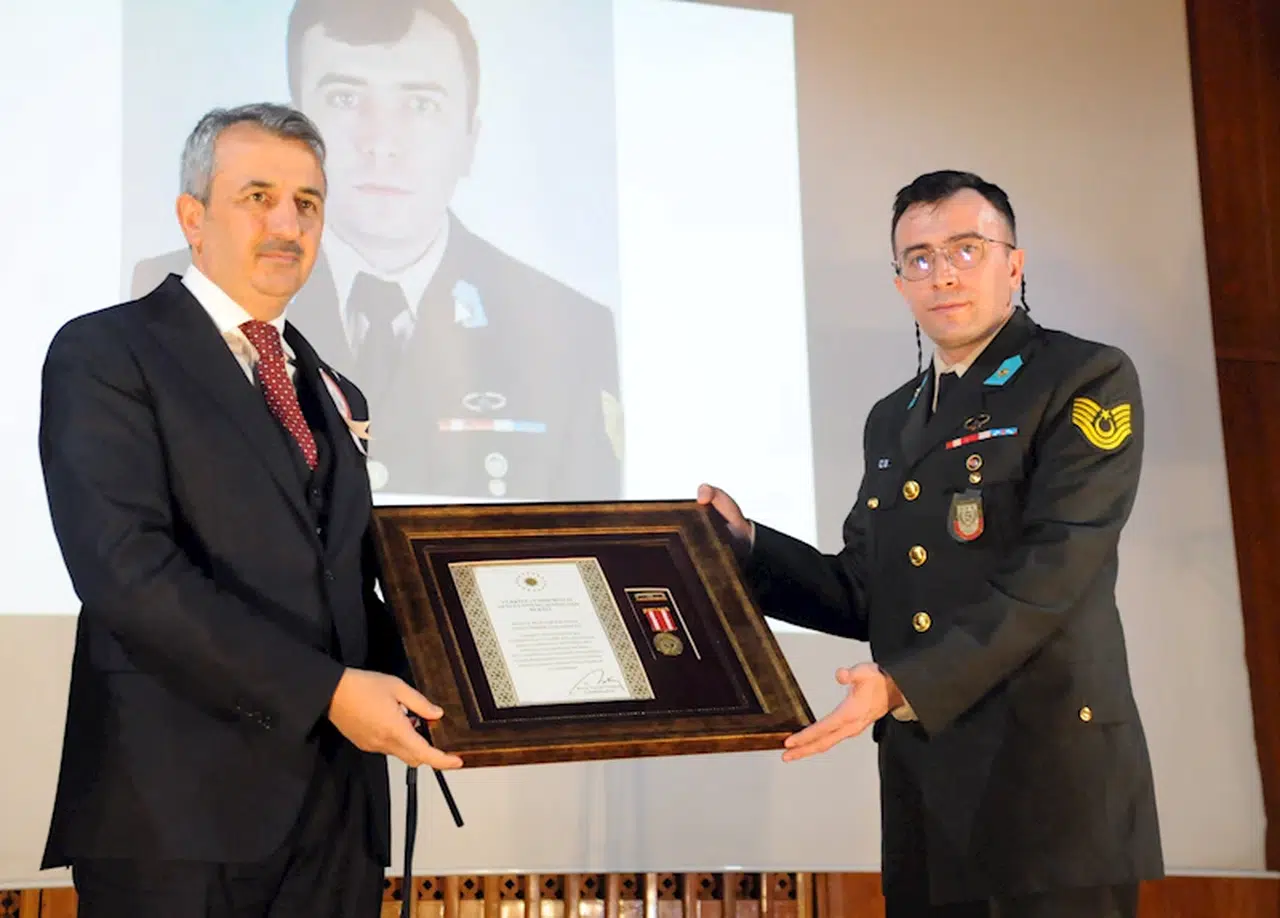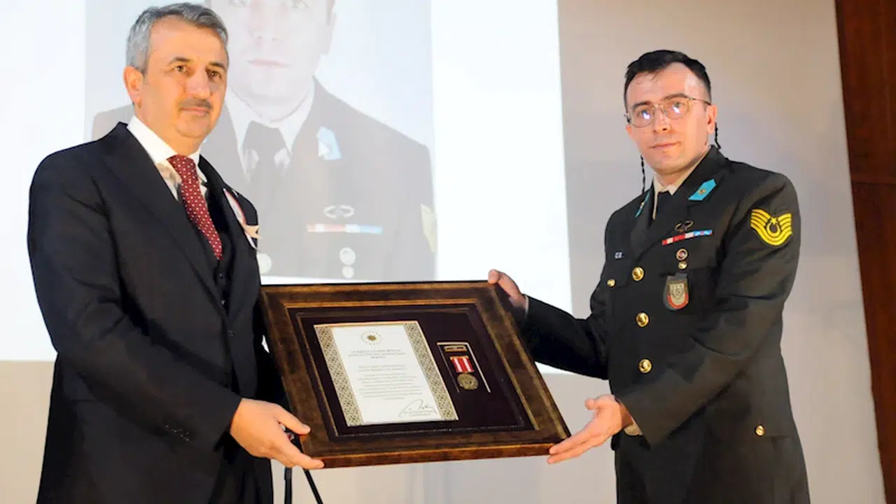 Olgay GÜLER/EDİRNE, (DHA)- EDİRNE'de, 18 Mart Şehitleri Anma Günü ve Çanakkale Deniz Zaferi'nin 110'uncu yıl dönümü nedeniyle gerçekleştirilen programda, Suriye'nin El Bab bölgesinde terör saldırısında yaralanan Astsubay Kıdemli Üstçavuş İsmail Çolakoğlu'na, 'Devlet Övünç Madalyası ve Beratı' verildi.