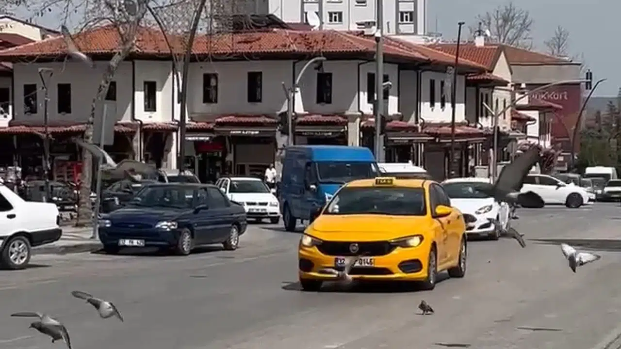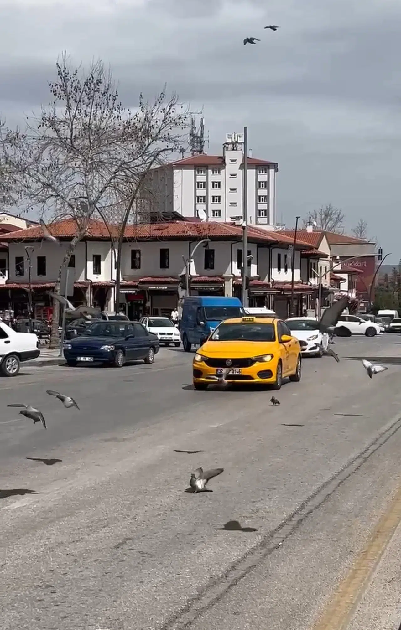 Isparta kent merkezinin en işlek noktalarından Kaymakkapı Meydanı'nda güvercin sürüsü trafiği aksattı. Yola konup, yiyecek arayan güvercinler gelen araçlara aldırış etmedi. Güvercinler yoldan çekilmeyince sürücülerden biri araçtan inip, uzaklaştırmaya çalıştı. Uçup, tekrar yola konan güvercinler nedeniyle sürücüler zor anlar yaşadı. Bu durum vatandaşın cep telefonu kamerasıyla kaydedildi. (DHA)