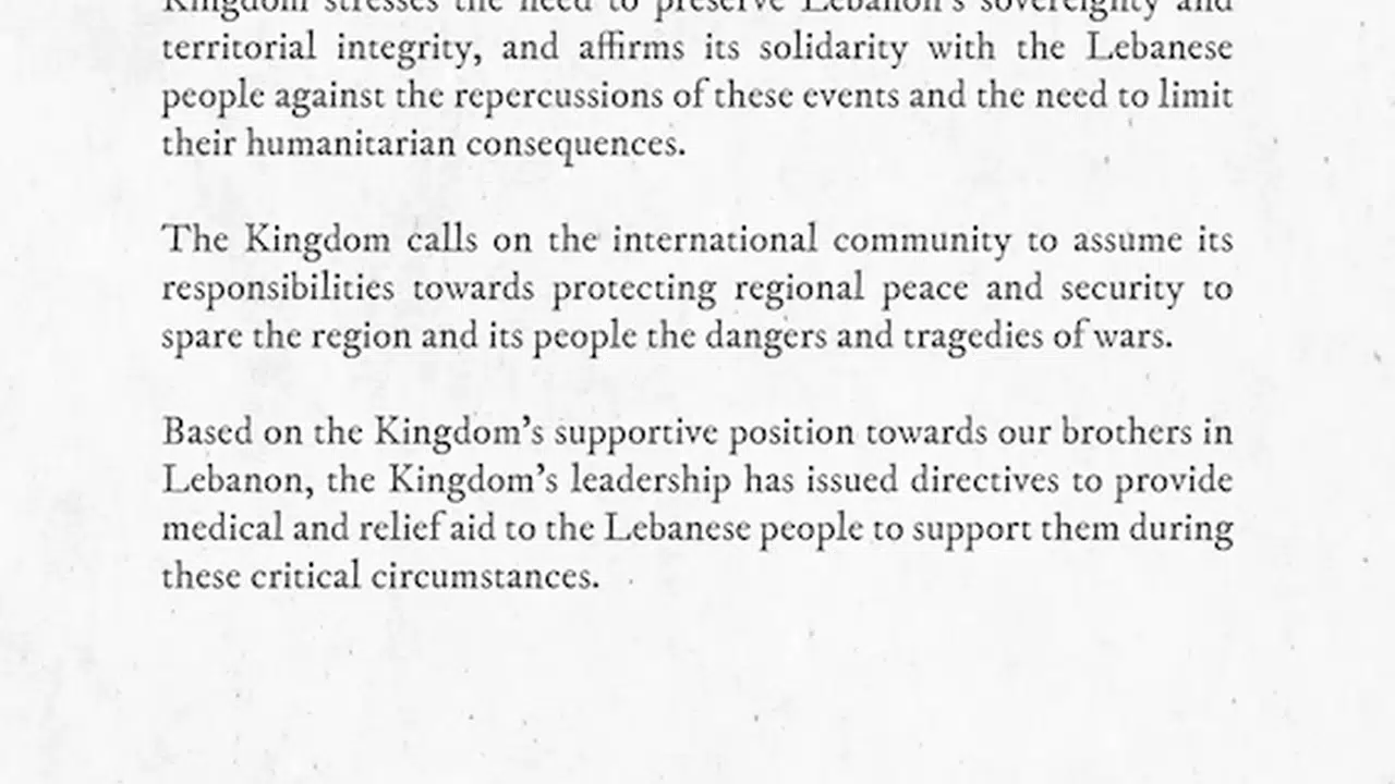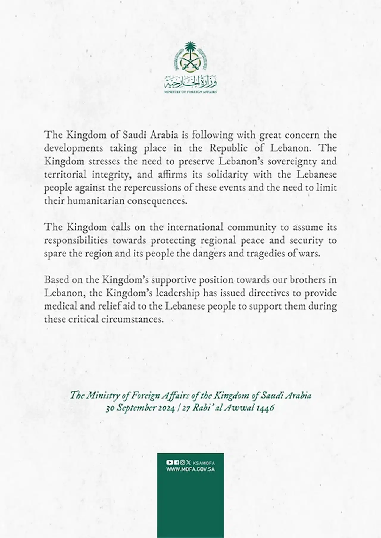 Suudi Arabistan Dışişleri Bakanlığı, Lübnan’daki gelişmelere ilişkin açıklamasında, “Suudi Arabistan, Lübnan Cumhuriyeti'nde meydana gelen gelişmeleri büyük bir endişeyle takip etmektedir. Krallık, Lübnan'ın egemenliğinin ve toprak bütünlüğünün korunması gerektiğini vurgulamakta ve Lübnan halkıyla dayanışma içinde olduğunu ifade etmektedir. Krallık, uluslararası toplumu, bölgeyi ve halkını savaşların tehlikelerinden ve trajedilerinden korumak için bölgesel barış ve güvenliği koruma sorumluluğunu üstlenmeye çağırmaktadır. Krallığın Lübnan'daki kardeşlerimize yönelik destekleyici tutumuna dayanarak, bu kritik koşullarda onları desteklemek için Lübnan halkına tıbbİ yardım ve insani yardımı sağlama yönünde talimatlar yayınlamıştır” dedi.