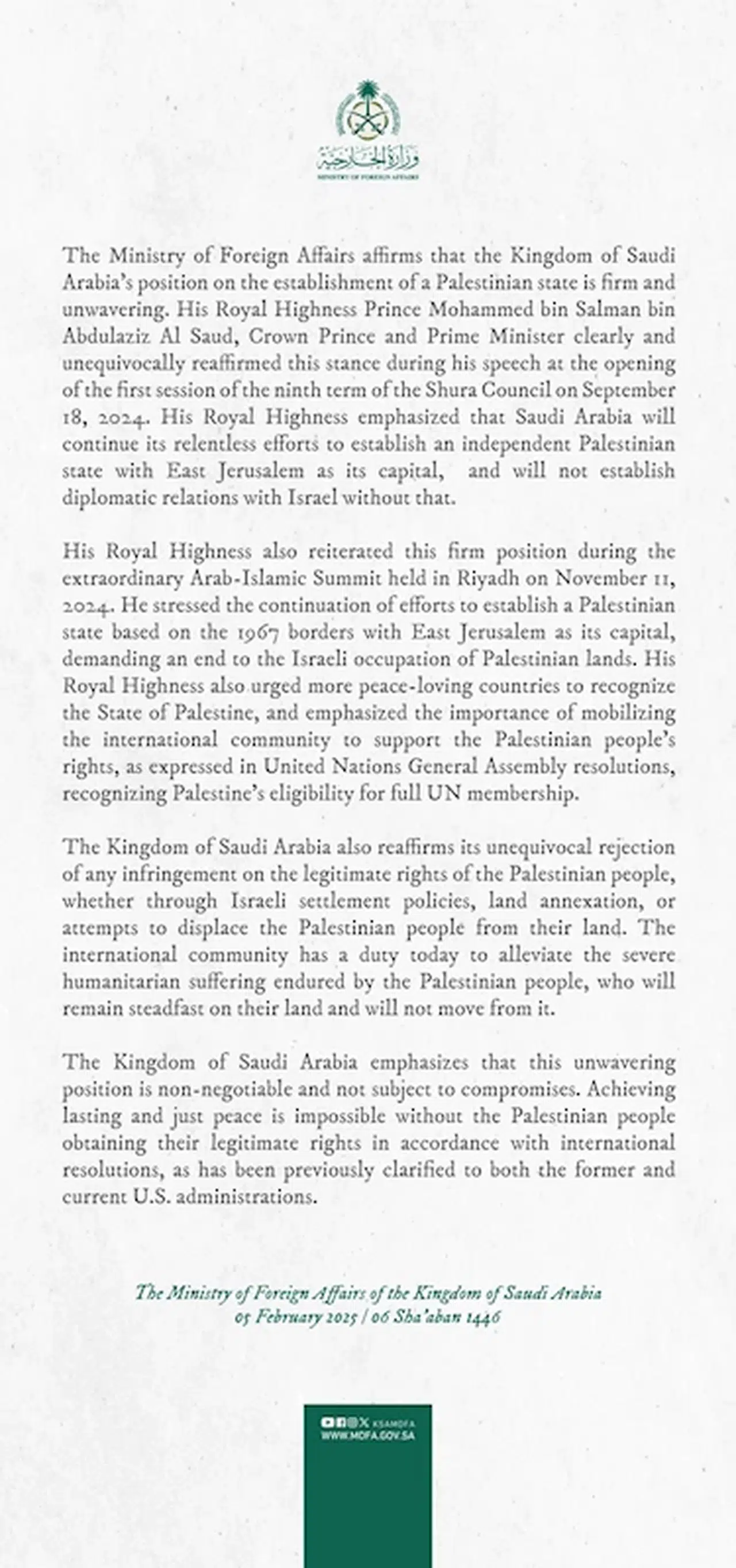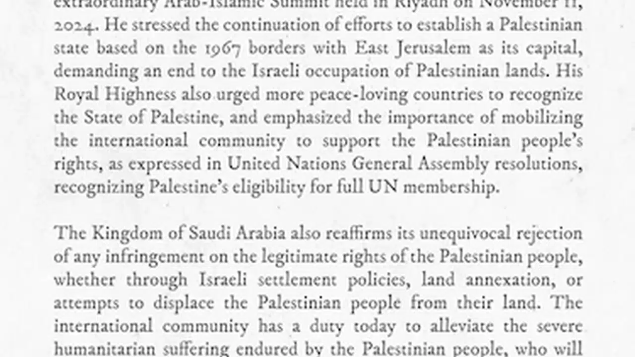 Açıklamada, Bin Selman'ın 18 Eylül 2024'te Şura Meclisi'nin dokuzuncu oturumunun birinci yılının açılışında yaptığı konuşma anımsatılarak, “Suudi Arabistan'ın başkenti Doğu Kudüs olan bağımsız bir Filistin devleti kurmak için amansız çabalarını sürdüreceğini ve bunun olmadan İsrail ile diplomatik ilişki kurmayacağını vurguladı” denildi.