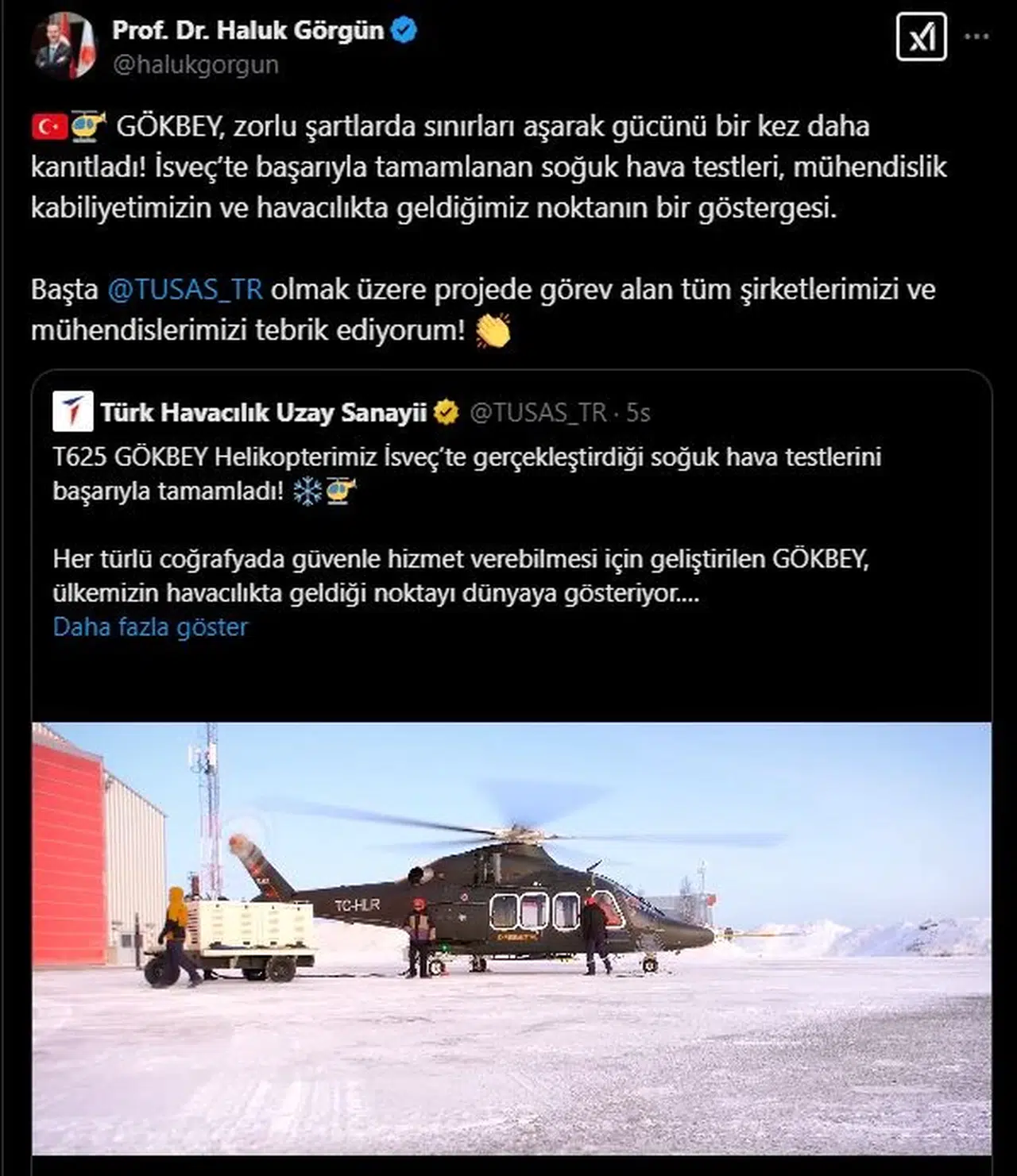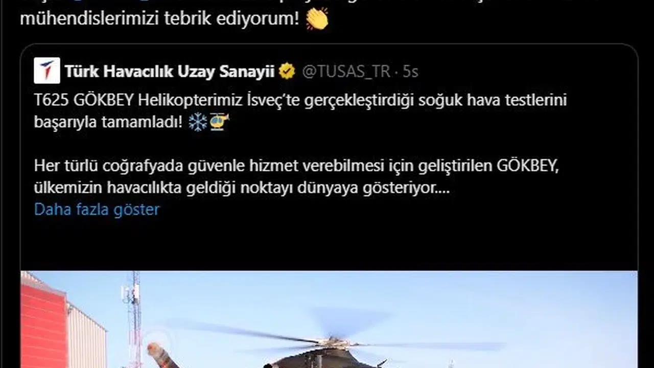 Savunma Sanayii Başkanı Haluk Görgün, TUSAŞ tarafından geliştirilen genel maksat helikopteri T625 GÖKBEY'in İsveç'te gerçekleştirdiği soğuk hava testlerini başarıyla tamamlamasına ilişkin sosyal medya hesabından açıklama yaptı. Görgün, "GÖKBEY, zorlu şartlarda sınırları aşarak gücünü bir kez daha kanıtladı. İsveç’te başarıyla tamamlanan soğuk hava testleri, mühendislik kabiliyetimizin ve havacılıkta geldiğimiz noktanın bir göstergesi. Başta TUSAŞ olmak üzere projede görev alan tüm şirketlerimizi ve mühendislerimizi tebrik ediyorum" dedi. (DHA)