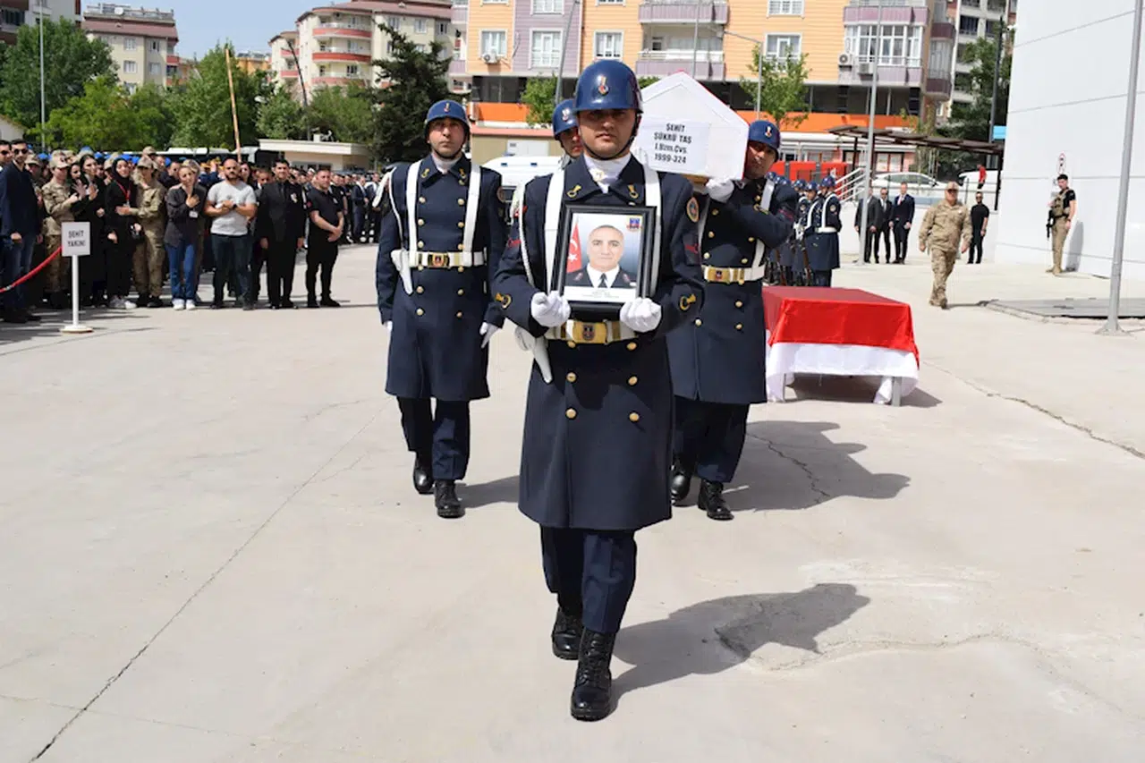Bayram AYHAN/BATMAN, (DHA)- BATMAN’ın Beşiri ilçesinde 18 Nisan’da görevi sırasında silah bakımı yaparken tabancasının kazara ateş alması sonucu yaralanan Jandarma Uzman Çavuş Şükrü Taş (52), tedavi gördüğü hastanede şehit oldu. Şehit Taş’ın cenazesi, düzenlenen törenle memleketi Mardin’in Midyat ilçesine uğurlandı.