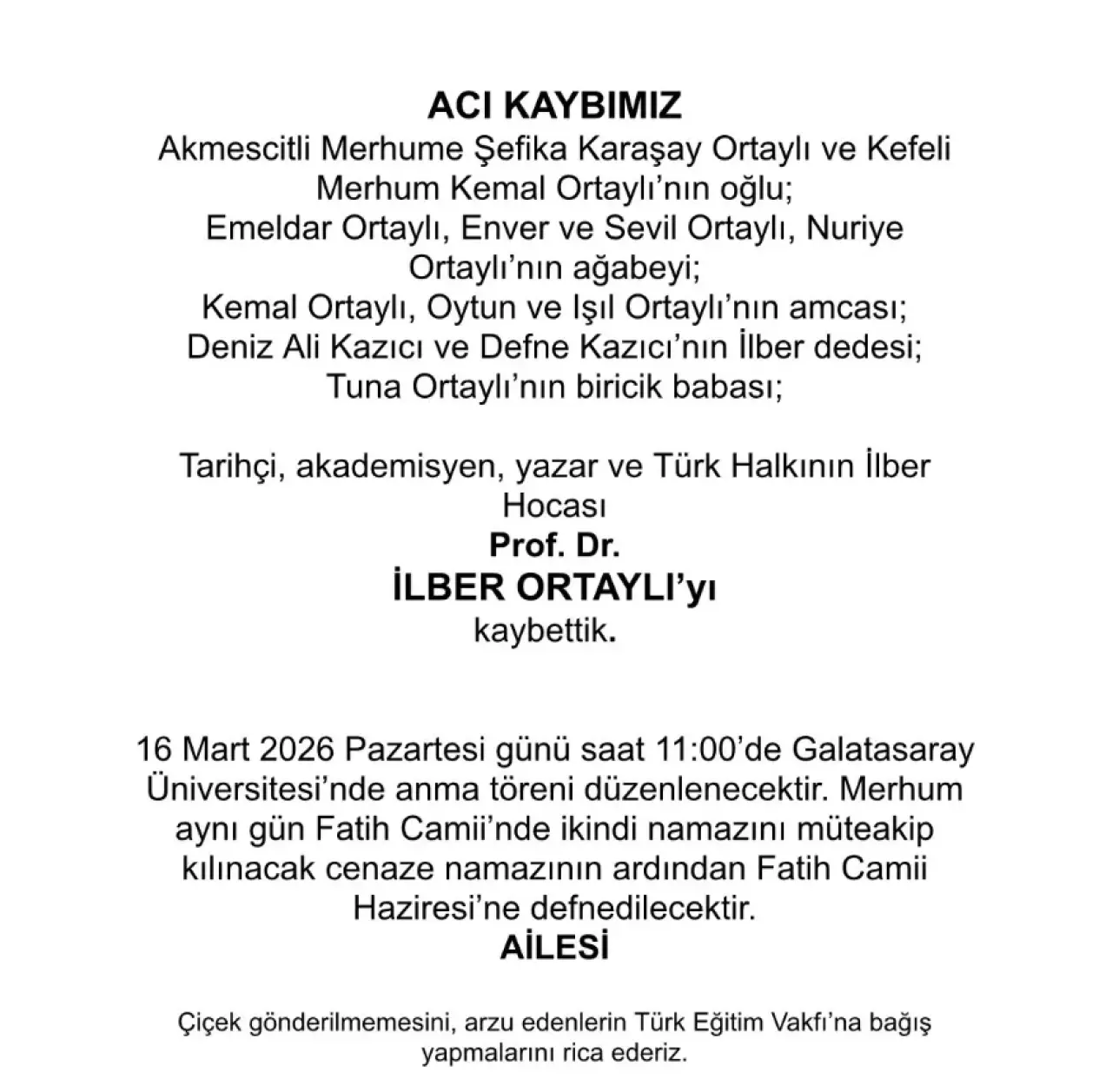 Aile tarafından yapılan duyuruda cenaze töreni için çiçek gönderilmemesi rica edildi. Bunun yerine isteyenlerin Türk Eğitim Vakfı’na bağış yapabileceği belirtildi.