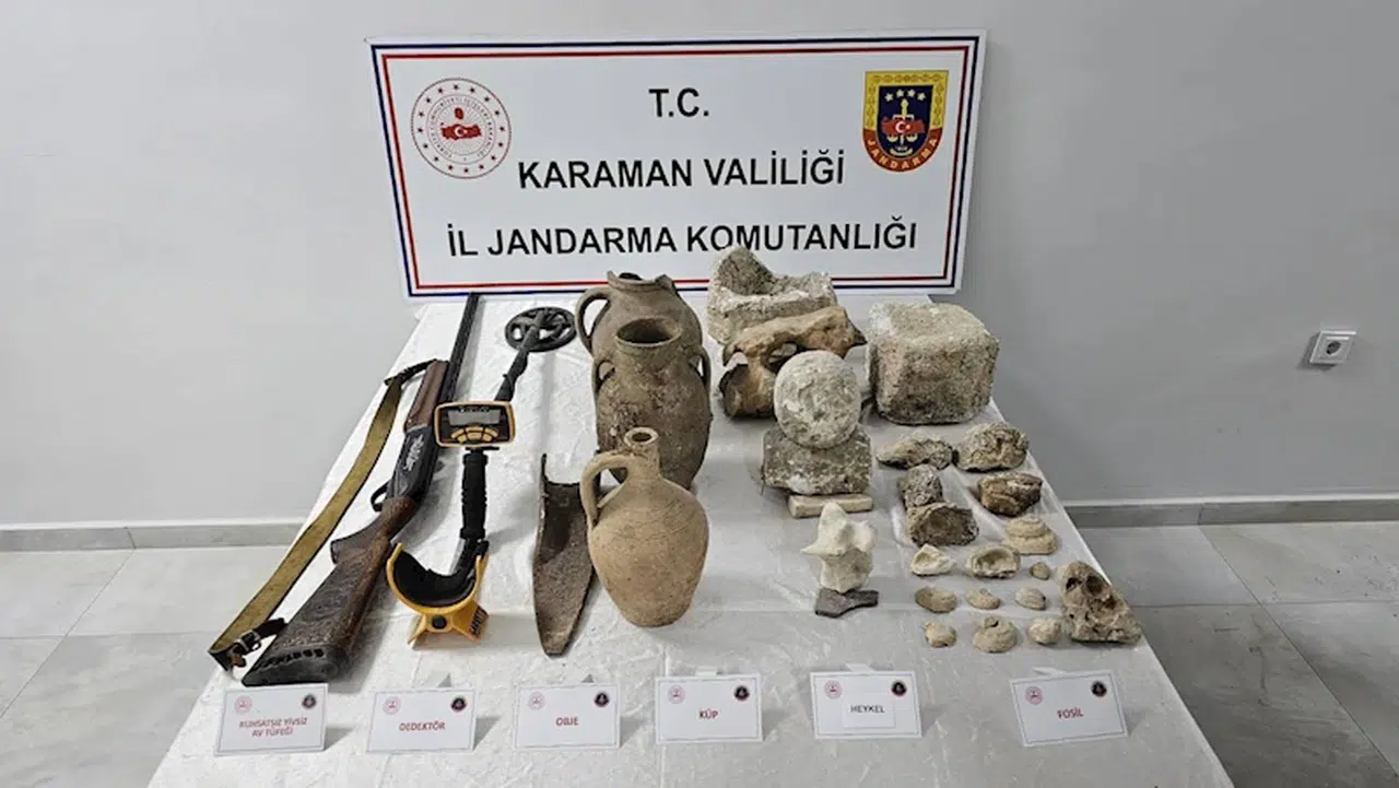 Karaman İl Jandarma Komutanlığı Kaçakçılık ve Organize Suçlarla Mücadele Şubesi ekipleri, Ermenek ilçesi Kazancı Beldesinde oturan İ.A.'nın, tarihi eser satmak için müşteri aradığı bilgisini aldı. Bunun üzerine çalışma başlatan jandarma, İ.A.'nın adresine ve bağ evine operasyon düzenlendi. Operasyonda 2 adet oyma taş, 25 adet fosil, 1 adet insan figürü, 2 adet figür işlemeli taş, 3 adet küp, 1 adet metal obje, 1 adet yazıt, 1 adet sütun gövdesi, 5 adet sütun ayağı, 1 adet define arama dedektörü ile ruhsatsız av tüfeği ele geçirildi. Bunun üzerine İ.A. gözaltına alındı. (DHA)FOTOĞRAFLI