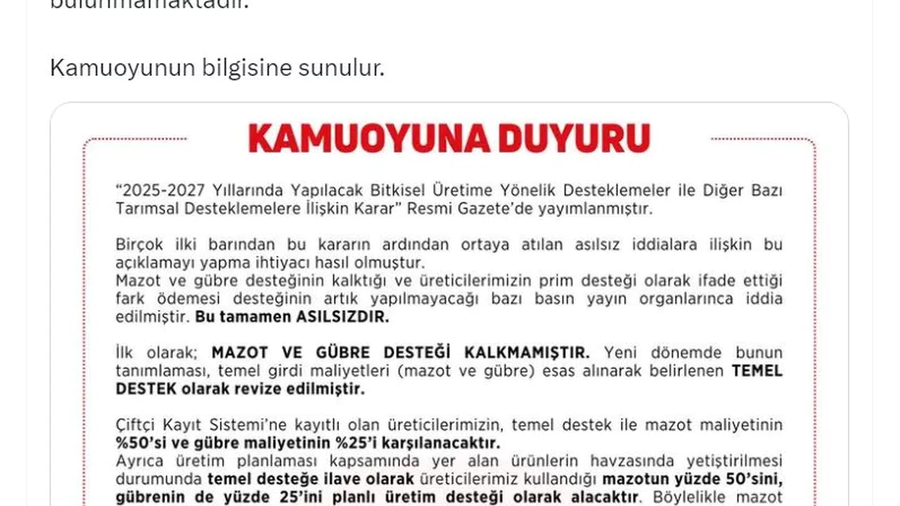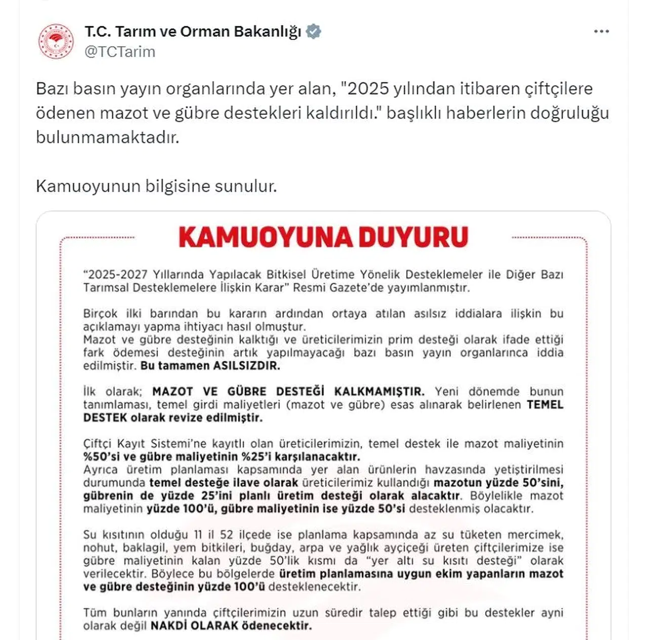 Bakanlığın sosyal medya hesabından yapılan açıklamada, '2025-2027 Yıllarında Yapılacak Bitkisel Üretime Yönelik Desteklemeler ile Diğer Bazı Tarımsal Desteklemelere İlişkin Karar'ın bugün Resmi Gazete'de yayımlandığı hatırlatarak, birçok ilki barından bu kararın ardından ortaya bazı asılsız iddialar atıldığı belirtildi. Bazı basın yayın organlarında; mazot ve gübre desteğinin kalktığı ve üreticilerin 'prim desteği' olarak ifade ettiği fark ödemesi desteğinin artık yapılmayacağının iddia edildiği ancak bunun tamamen asılsız olduğu vurgulanarak, "İlk olarak; mazot ve gübre desteği kalkmamıştır. Yeni dönemde bunun tanımlaması, temel girdi maliyetleri (mazot ve gübre) esas alınarak belirlenen 'Temel Destek' olarak revize edilmiştir. Çiftçi Kayıt Sistemi'ne kayıtlı olan üreticilerimizin, temel destek ile mazot maliyetinin yüzde 50'si ve gübre maliyetinin yüzde 25'i karşılanacaktır. Ayrıca üretim planlaması kapsamında yer alan ürünlerin havzasında yetiştirilmesi durumunda temel desteğe ilave olarak üreticilerimiz kullandığı mazotun yüzde 50'sini, gübrenin de yüzde 25'ini planlı üretim desteği olarak alacaktır. Böylelikle mazot maliyetinin yüzde 100'ü, gübre maliyetinin ise yüzde 50'si desteklenmiş olacaktır" denildi.