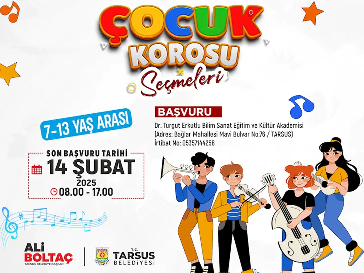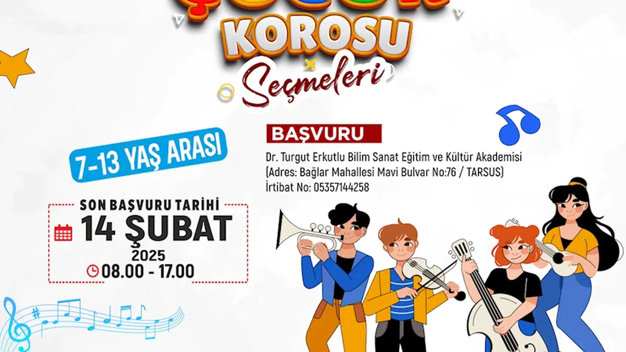 Tarsus Belediyesi, çocukların müziğe olan ilgisini artırmak ve onları sanatsal bir ortamda bir araya getirmek amacıyla Çocuk Korosu seçmeleri düzenliyor. Koro, yetenekli çocuklara profesyonel bir ortamda eğitim alma fırsatı sunacak. Başvuru yapmak isteyenler Dr. Turgut Erkutlu Bilim Sanat Eğitim ve Kültür Akademisi'nde kayıt yaptırabilecek. 7-13 yaş arası çocukların katılabileceği koro, müziğe ilgisi olan minik yeteneklere hem kendilerini geliştirme, hem de keyifli bir deneyim yaşama fırsatı sunacak. Son başvurular 14 Şubat Cuma günü mesai bitimine kadar kabul edilecek.