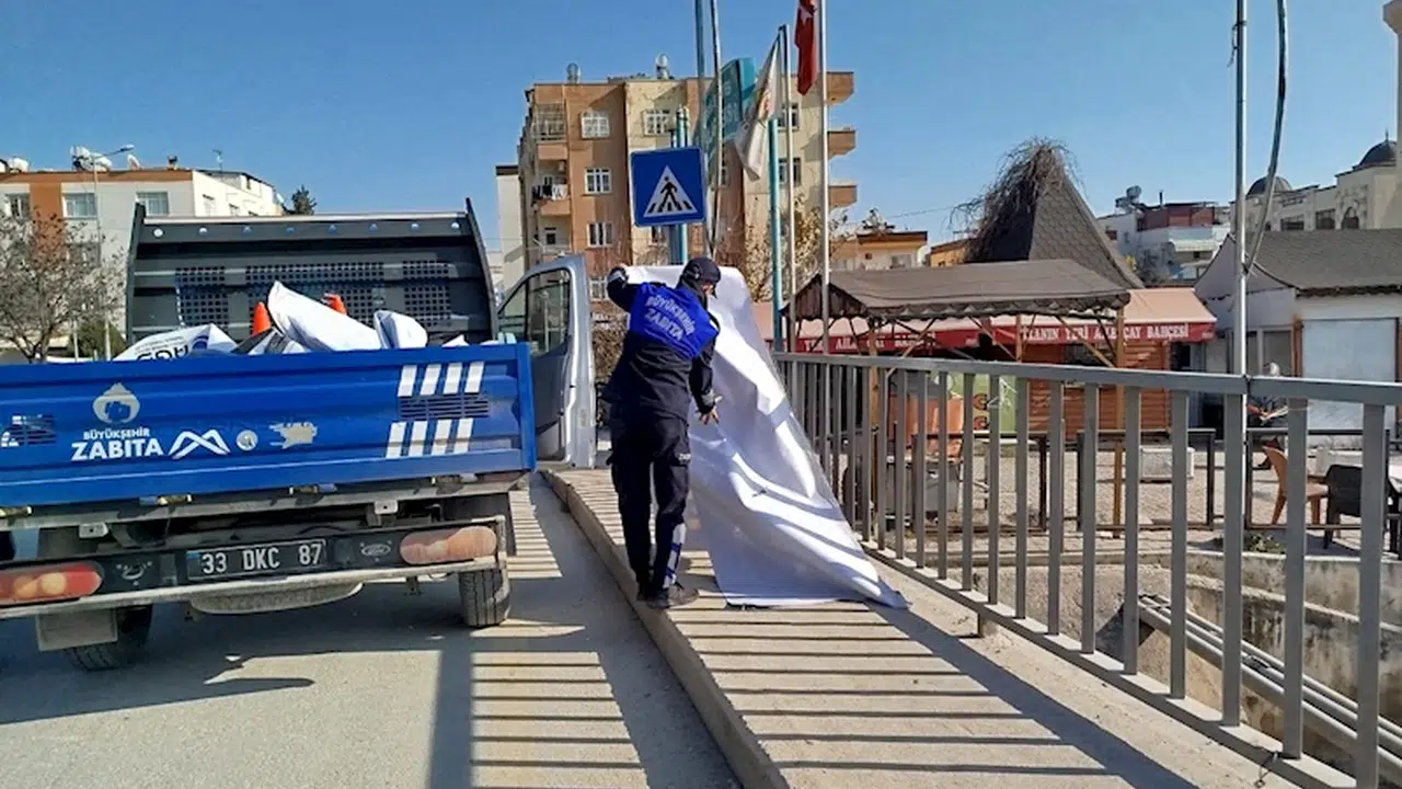 Tarsus’ta kent estetiğini bozan afiş ve pankartlar toplanıyor