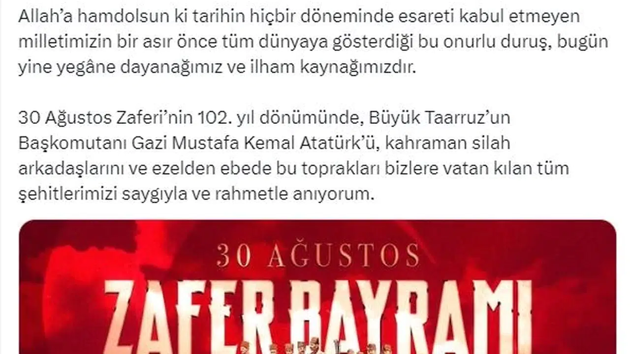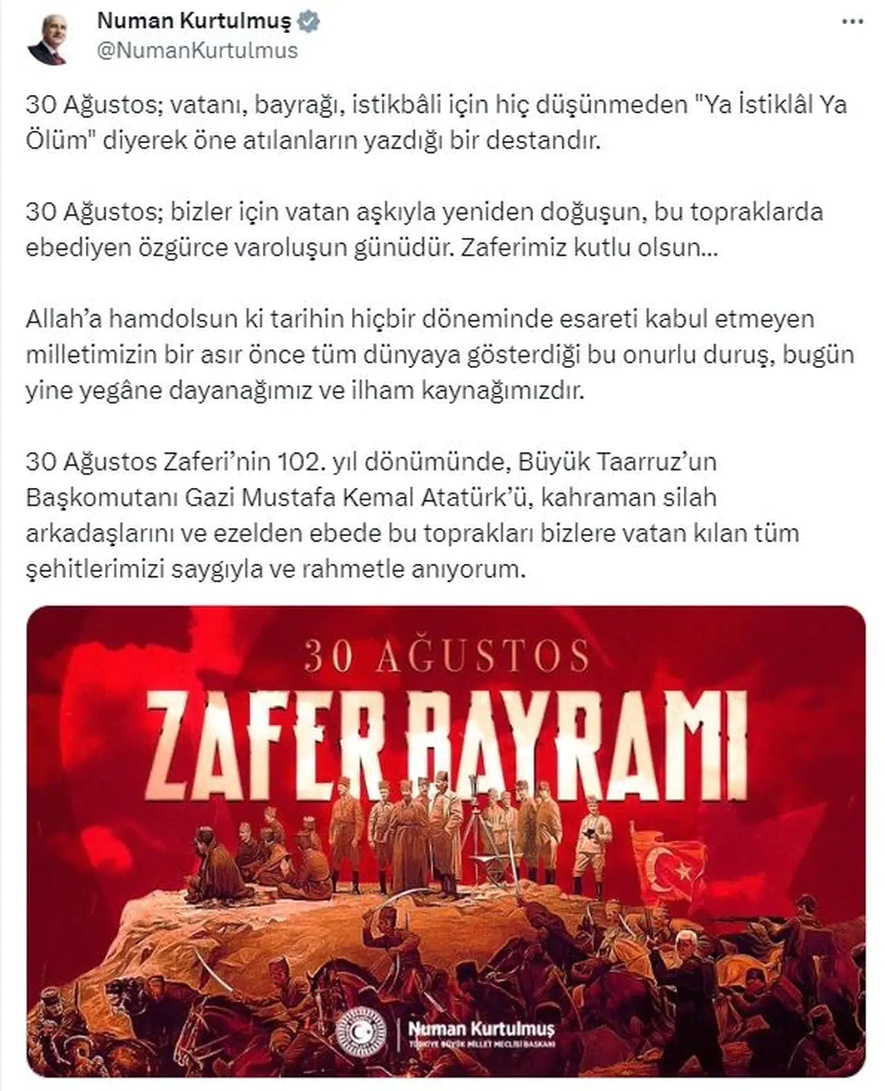 Aliekber METE/ANKARA, (DHA)- TÜRKİYE Büyük Millet Meclisi (TBMM) Başkanı Numan Kurtulmuş, "30 Ağustos; bizler için vatan aşkıyla yeniden doğuşun, bu topraklarda ebediyen özgürce varoluşun günüdür. Zaferimiz kutlu olsun" dedi.