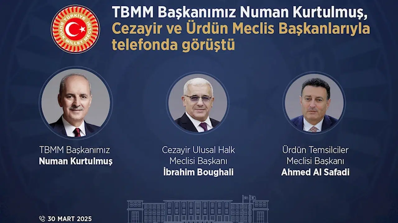 Aliekber METE/ANKARA, (DHA)- TBMM Başkanı Numan Kurtulmuş, Cezayir Ulusal Halk Meclisi Başkanı İbrahim Boughali ve Ürdün Temsilciler Meclisi Başkanı Ahmed Al Safadi ile telefonda görüştü.