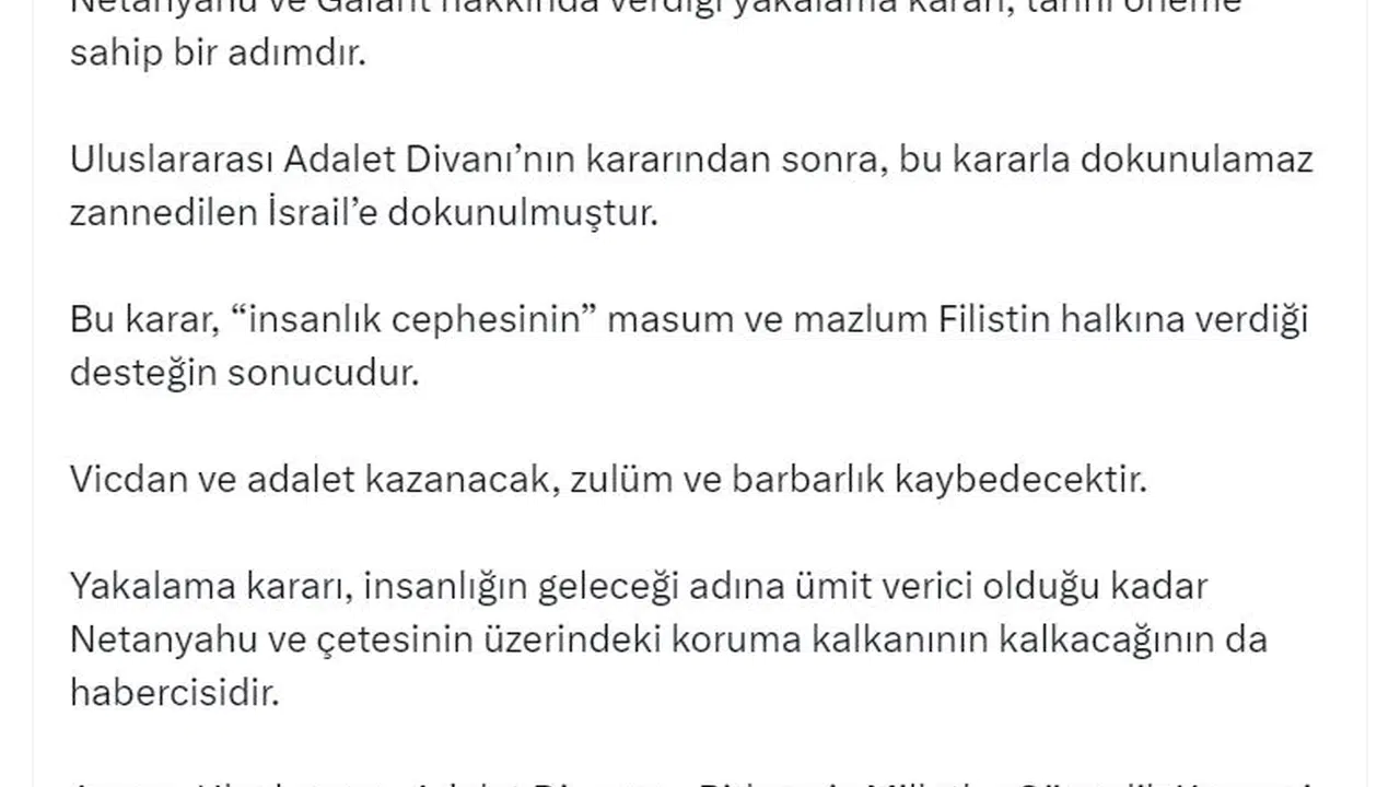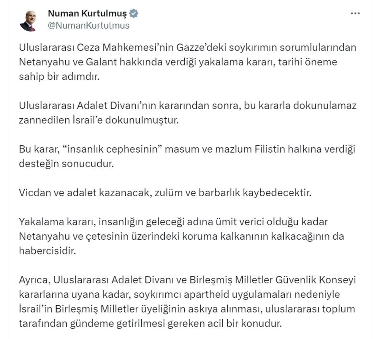 ANKARA, (DHA)- TÜRKİYE Büyük Millet Meclisi (TBMM) Başkanı Numan Kurtulmuş, "Uluslararası Ceza Mahkemesi'nin Gazze'deki soykırımın sorumlularından Netanyahu ve Galant hakkında verdiği yakalama kararı, tarihi öneme sahip bir adımdır. Uluslararası Adalet Divanı'nın kararından sonra, bu kararla dokunulamaz zannedilen İsrail'e dokunulmuştur" dedi.