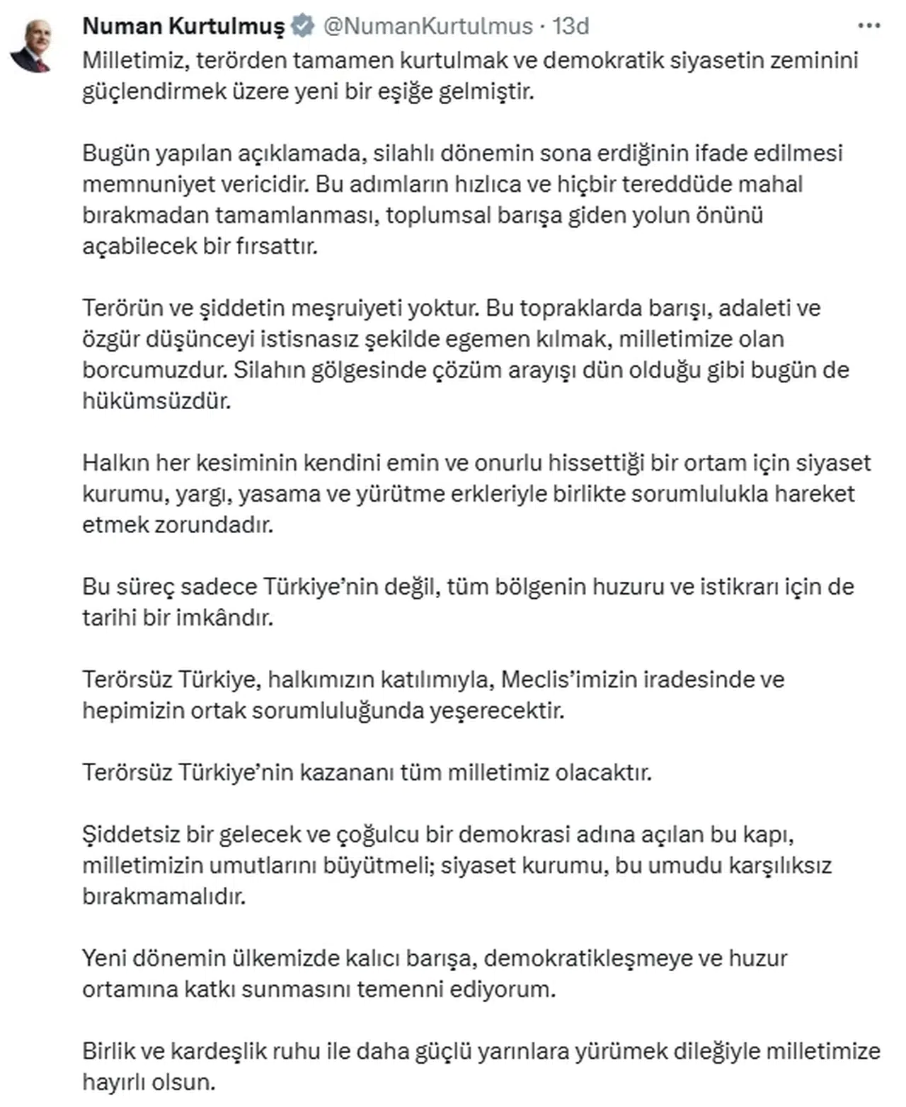 ANKARA, (DHA)- TBMM Başkanı Numan Kurtulmuş, terör örgütü PKK'nın fesih ve silah bırakma kararının memnuniyet verici olduğunu belirterek, "Terörsüz Türkiye, halkımızın katılımıyla, Meclis'imizin iradesinde ve hepimizin ortak sorumluluğunda yeşerecektir. Terörsüz Türkiye'nin kazananı tüm milletimiz olacaktır" dedi.