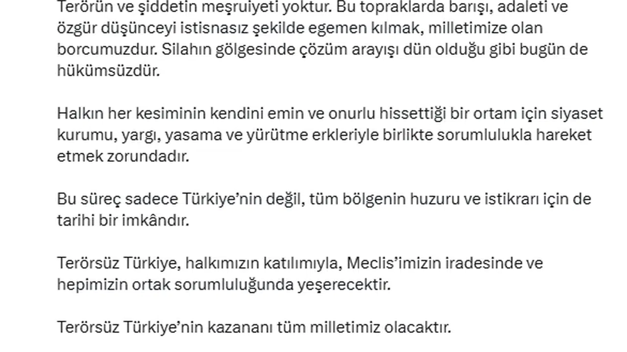 TBMM Başkanı Numan Kurtulmuş, sosyal medya hesabı üzerinden yaptığı açıklamada, "Milletimiz, terörden tamamen kurtulmak ve demokratik siyasetin zeminini güçlendirmek üzere yeni bir eşiğe gelmiştir. Bugün yapılan açıklamada, silahlı dönemin sona erdiğinin ifade edilmesi memnuniyet vericidir. Bu adımların hızlıca ve hiçbir tereddüde mahal bırakmadan tamamlanması, toplumsal barışa giden yolun önünü açabilecek bir fırsattır. Terörün ve şiddetin meşruiyeti yoktur. Bu topraklarda barışı, adaleti ve özgür düşünceyi istisnasız şekilde egemen kılmak, milletimize olan borcumuzdur. Silahın gölgesinde çözüm arayışı dün olduğu gibi bugün de hükümsüzdür. Halkın her kesiminin kendini emin ve onurlu hissettiği bir ortam için siyaset kurumu, yargı, yasama ve yürütme erkleriyle birlikte sorumlulukla hareket etmek zorundadır. Bu süreç sadece Türkiye'nin değil, tüm bölgenin huzuru ve istikrarı için de tarihi bir imkandır. Terörsüz Türkiye, halkımızın katılımıyla, Meclis’imizin iradesinde ve hepimizin ortak sorumluluğunda yeşerecektir. Terörsüz Türkiye’nin kazananı tüm milletimiz olacaktır. Şiddetsiz bir gelecek ve çoğulcu bir demokrasi adına açılan bu kapı, milletimizin umutlarını büyütmeli; siyaset kurumu, bu umudu karşılıksız bırakmamalıdır. Yeni dönemin ülkemizde kalıcı barışa, demokratikleşmeye ve huzur ortamına katkı sunmasını temenni ediyorum. Birlik ve kardeşlik ruhu ile daha güçlü yarınlara yürümek dileğiyle milletimize hayırlı olsun" ifadelerine yer verdi. (DHA)