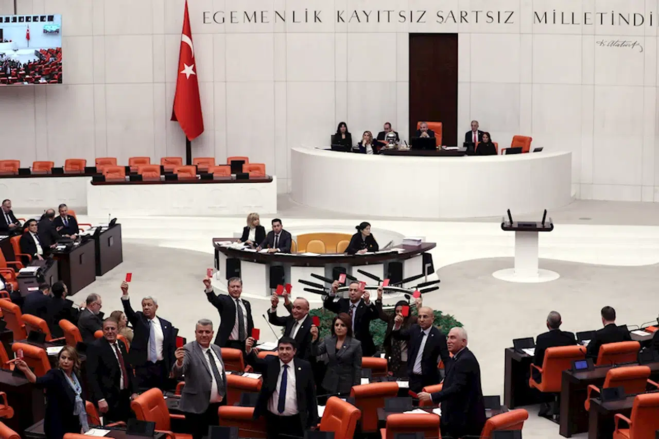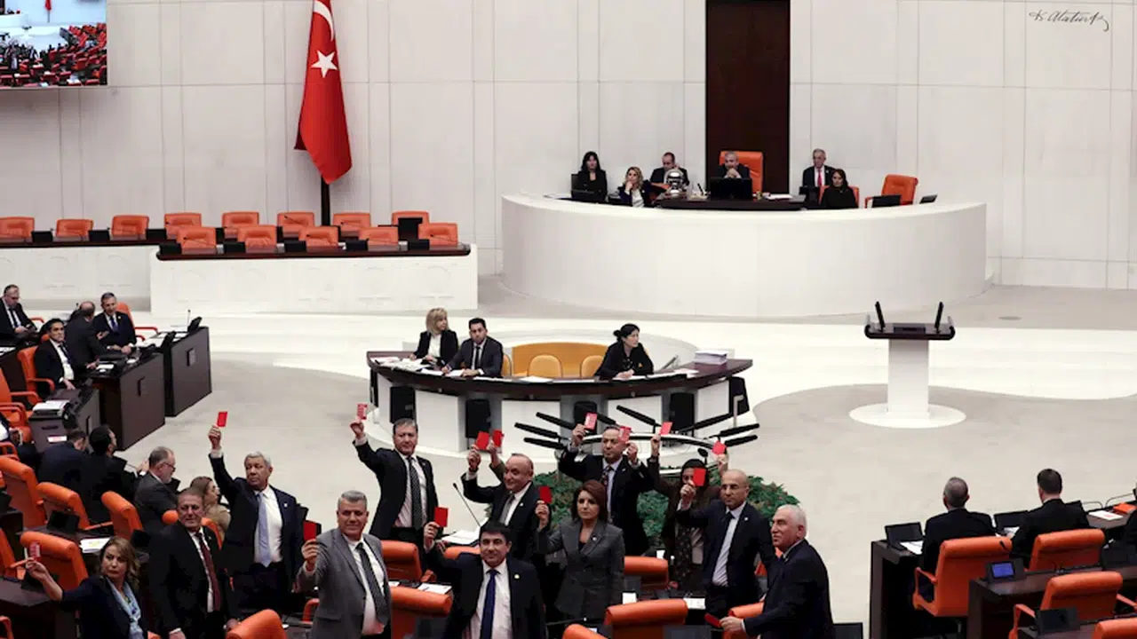 Aliekber METE/ANKARA, (DHA)- TBMM Genel Kurulu'nda, CHP Grup Başkanvekili Murat Emir, Türkiye'deki ekonomik problemleri gündeme getirerek "Ayağa kalkıyoruz ve kırmızı kart gösteriyoruz. Herkes için, hakkı yenen herkes için kırmızı kart gösteriyoruz. 14 bin 469 lira emekli maaşını kabul etmeyenler adına kırmızı kart gösteriyoruz. 22 bin 104 lira asgari ücreti, açlık ücretini kabul etmeyenler için kırmızı kart gösteriyoruz" dedi ve CHP'li milletvekilleri de Genel Kurul'da kırmızı kart gösterdi.
