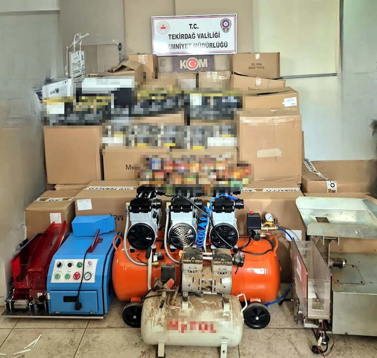 İl Emniyet Müdürlüğü ekipleri, kaçakçılık faaliyetlerinin önlenmesi kapsamında yaptığı çalışmalarda Çorlu ve Kapaklı ilçelerinde kaçak tütün ürünlerinin bulunduğu adresleri belirledi. Adreslerdeki aramalarda 305 bin 260 dolu ve boş makaron, 490 kilo açık kıyılmış tütün, 131 paketli tütün, 69 adet 17 kilo 260 gram nargile tütünü, 302 mükerrer bandrol, 2 makaron dolum makinesi, 2 kompresör, 7 elektronik sigara ele geçirildi. Polisin gözaltına aldığı 4 şüpheli hakkında yasal işlem yapıldı. (DHA)