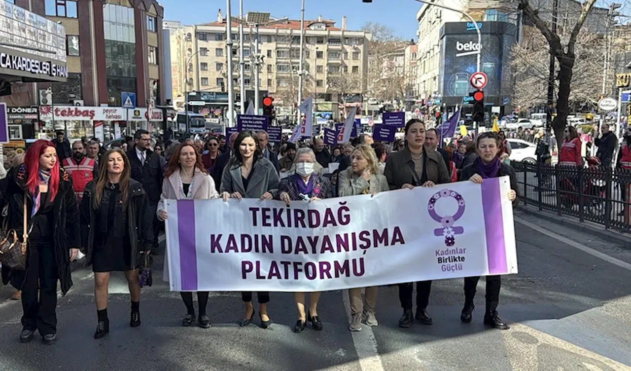 Tekirdağ Büyükşehir Belediyesi ve Tekirdağ Kadın Dayanışma Palatformu tarafından düzenlenen, 'Kadınlar birlikte güçlü' yürüyüşü için kadınlar, Köprübaşı mevkisinde toplandı. Elerinde pankart ve dövizlerle Hükümet Caddesi üzerinden valilik önüne yürüyen kadınlara çevredekiler de destek verdi. Yürüyüşe; CHP Tekirdağ milletvekilleri Faik Öztrak, Nurten Yontar, İlhami Özcan Aygun da katıldı. Yürüyüşün ardından AK Parti Tekirdağ İl Kadın Kolları ve CHP Tekirdağ İl Kadın Kolları ile kadın dernekleri Atatürk Anıtı'na çelenk koydu, saygı duruşunda bulunuldu, İstiklal Marşı okundu. Tekirdağ Kadın Dernekleri Platformu adına konuşan Filiz Çetin, kadının tarihsel ve toplumsal süreçler boyunca hayatın her alanında var olduğunu söyledi. Çetin, 8 Mart'ın sadece bir anma günü olmadığını, kadınların kararlılık ve cesaretlerini simgeleyen bir gün olduğunu dile getirdi. (DHA)