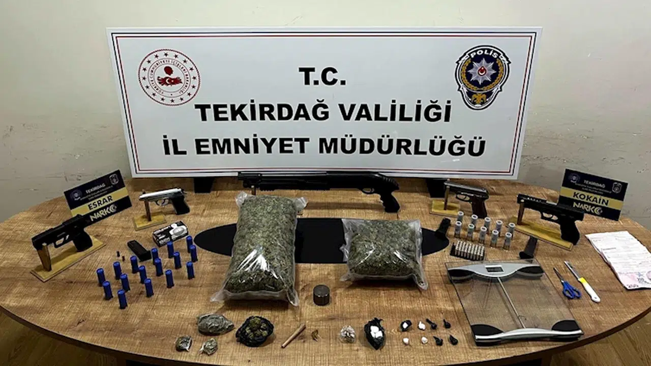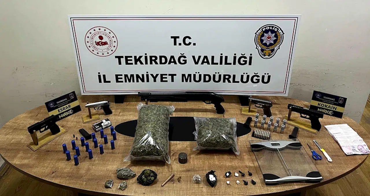 Çorlu Emniyet Müdürlüğü Narkotik Suçlarla Mücadele Büro Amirliği ekipleri, Çorlu Cumhuriyet Başsavcılığı’nın talimatıyla ‘torbacı’ olarak tabir edilen sokakta uyuşturucu satanlara yönelik çalışma yaptı. Çalışmanın ardından belirlenen şüpheliler N.T. ve L.T.’nin ev ve iş yerlerine baskın düzenlendi. Adreslerde yapılan aramalarda, 1 kilo 450 gram esrar, 20 gram kokain, hassas terazi, bir miktar esrar, ruhsatsız 4 tabanca, 1 av tüfeği, bin 600 dolu makaron, elektronik sigara likitleri ele geçirildi.