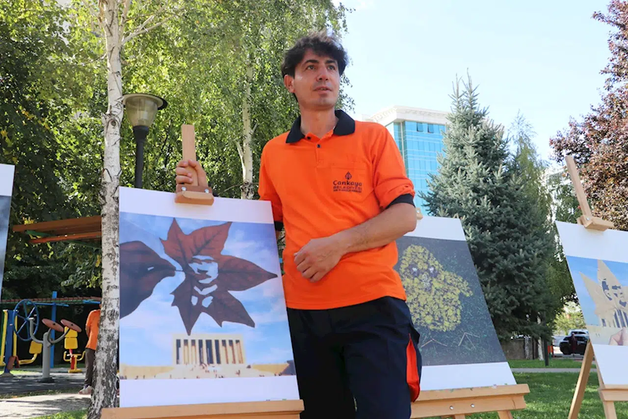 Gizem ÇORLU-Mehmet Gökhan HAKBİLİR/ANKARA, (DHA)- ANKARA'da Çankaya Belediyesi Park ve Bahçeler Müdürlüğü'nde temizlik işçisi olan Fırat Kalkan (46), parkları temizlerken topladığı yapraklardan yaptığı resim ve figürlerle 2 sergi açtı. Kalkan, "Resimlerimi almak isteyenler oldu. Ancak satmayı düşünmüyorum. Eğer ileride böyle bir şey olursa lösemili ve SMA'lı çocuklar yararına satmak isterim" dedi.