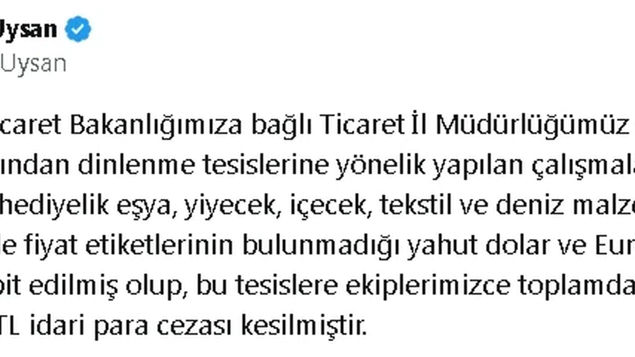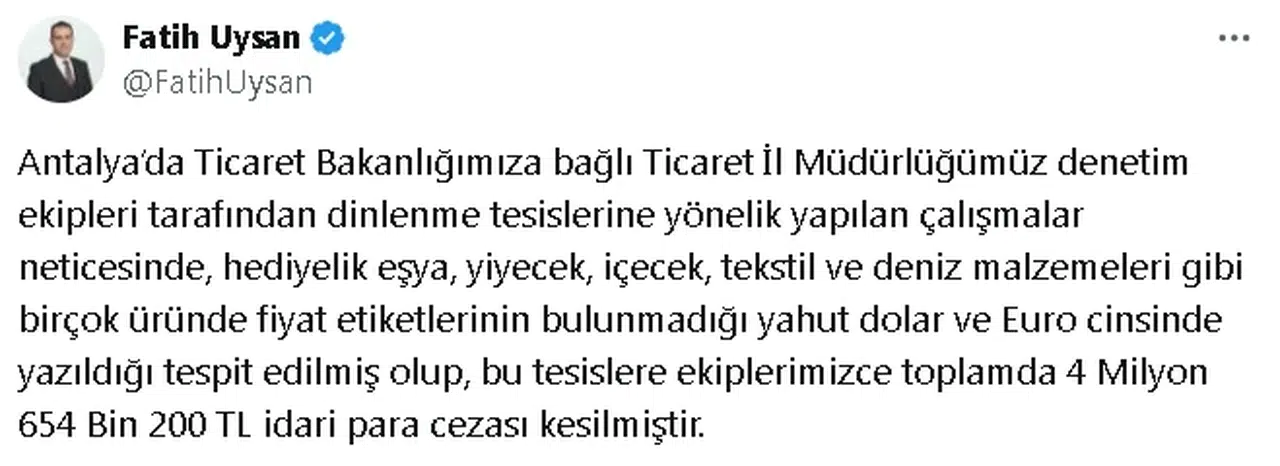 Ticaret Bakanlığı Basın ve Halkla İlişkiler Müşaviri Fatih Uysan, sosyal medya hesabı üzerinden yaptığı açıklamada, "Antalya’da Ticaret Bakanlığımıza bağlı Ticaret İl Müdürlüğümüz denetim ekipleri tarafından dinlenme tesislerine yönelik yapılan çalışmalar neticesinde, hediyelik eşya, yiyecek, içecek, tekstil ve deniz malzemeleri gibi birçok üründe fiyat etiketlerinin bulunmadığı yahut dolar ve avro cinsinde yazıldığı tespit edilmiş olup, bu tesislere ekiplerimizce toplamda 4 milyon 654 bin 200 TL idari para cezası kesilmiştir" ifadelerini kullandı. (DHA)