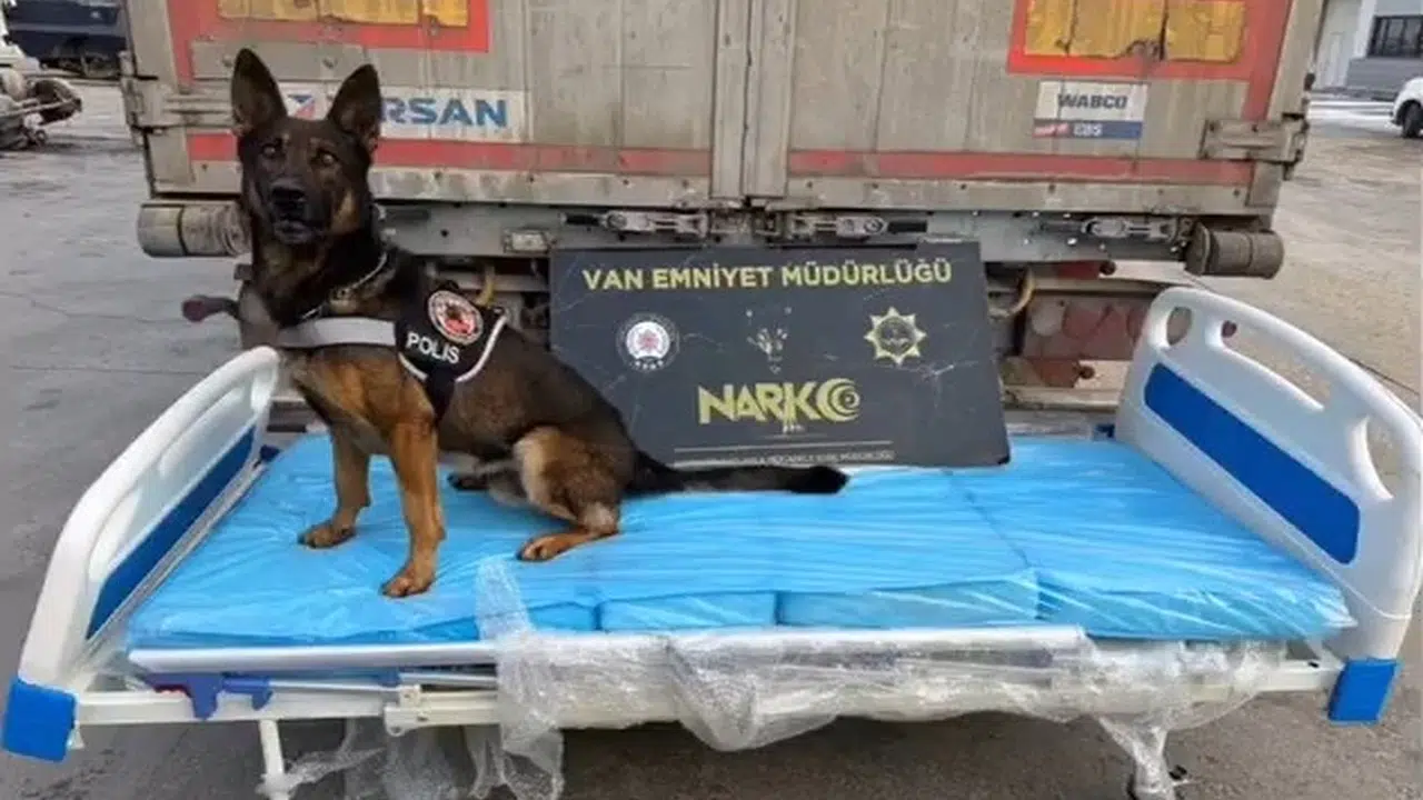 Gülay KUYUCU/VAN, (DHA)- VAN'da polis ekiplerinin, narkotik köpeği 'Thor' ile arama yaptığı TIR'da, sedye içine gizlenmiş 5 kilo 480 gram metamfetamin ele geçirildi, 4 şüpheli gözaltına alındı.