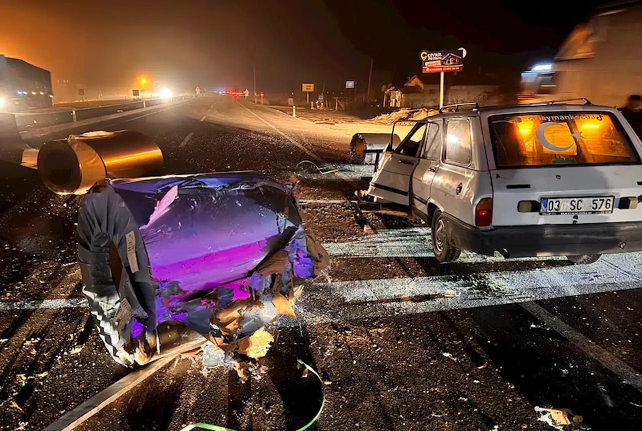 Kaza, dün saat 23.00 sıralarında, Bolvadin-Çay Karayolu'nda meydana geldi. A.K.'nin (34) kullandığı 31 AIT 025 plakalı TIR, çalışma yapılan yolda ani fren yaptı. TIR dorsesindeki 6 ton ağırlığındaki alüminyum rulodan 4'ü kasa kapağı açılarak yola savruldu. Rulolar, TIR'ın yanında ilerleyen S.K.'nin (21) kullandığı 03 SC 576 plakalı otomobilin üzerine düştü. Kazada sürücü S.K. ile yanındaki B.A. (18) yaralandı. Sağlık ekibi yaralıları Bolvadin Devlet Hastanesi'ne götürdü. Alüminyum rulo ve araçlar vinç yardımıyla yoldan kaldırıldı. (DHA)