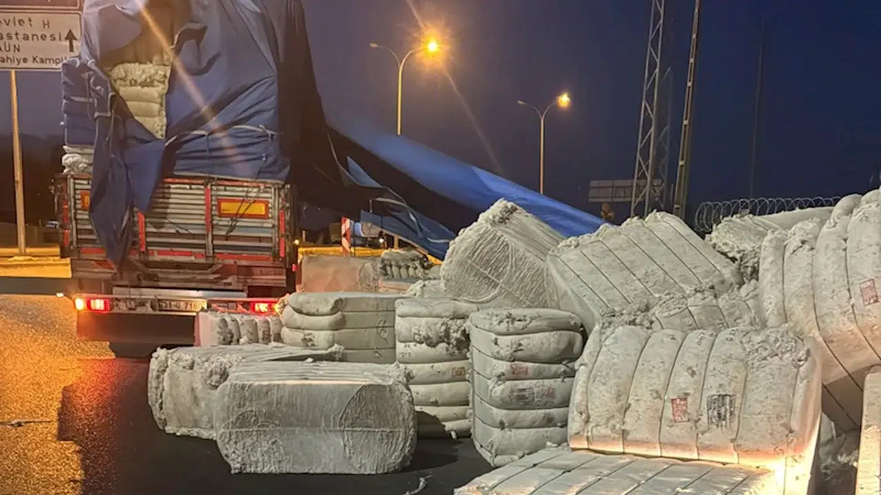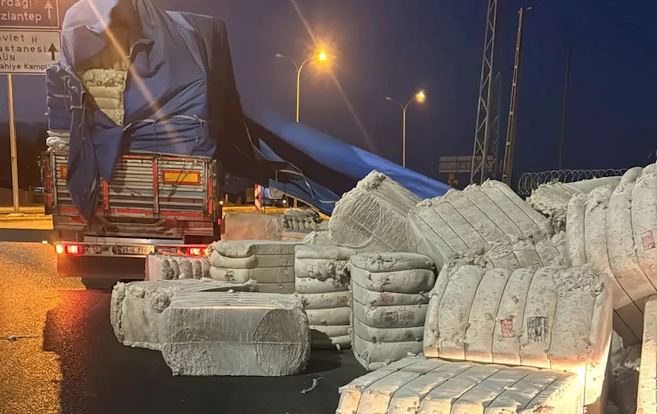 Olay, gece saatlerinde İslahiye-Hassa kara yolunun 5'inci kilometresinde meydana geldi. İddiaya göre, Cuma A. yönetimindeki 31 U 7160 TIR'ın dorsesindeki pamuk balyaları yola savruldu. İslahiye Belediyesi ekipleri iş makinesi ile pamuk balyalarını yolun kenarına aldı. Yoğunluk oluşan yoldaki trafik kontrollü şekilde açıldı. Pamuk balyaları olay yerine gelen başka bir TIR'a yüklendi. (DHA)