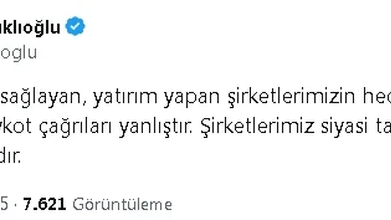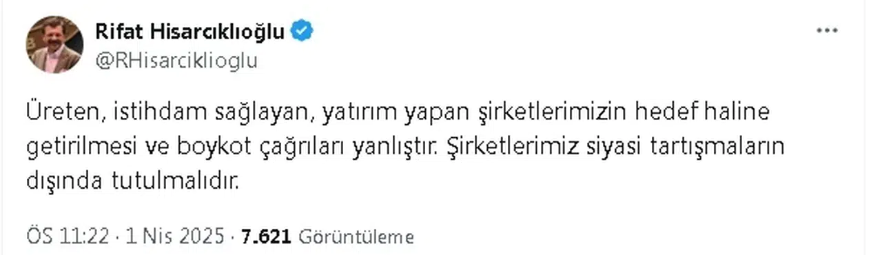 TOBB Başkanı Rıfat Hisarcıoğlu, sosyal medya hesabından yaptığı açıklamada, "Üreten, istihdam sağlayan, yatırım yapan şirketlerimizin hedef haline getirilmesi ve boykot çağrıları yanlıştır. Şirketlerimiz siyasi tartışmaların dışında tutulmalıdır" ifadelerini kullandı. (DHA)