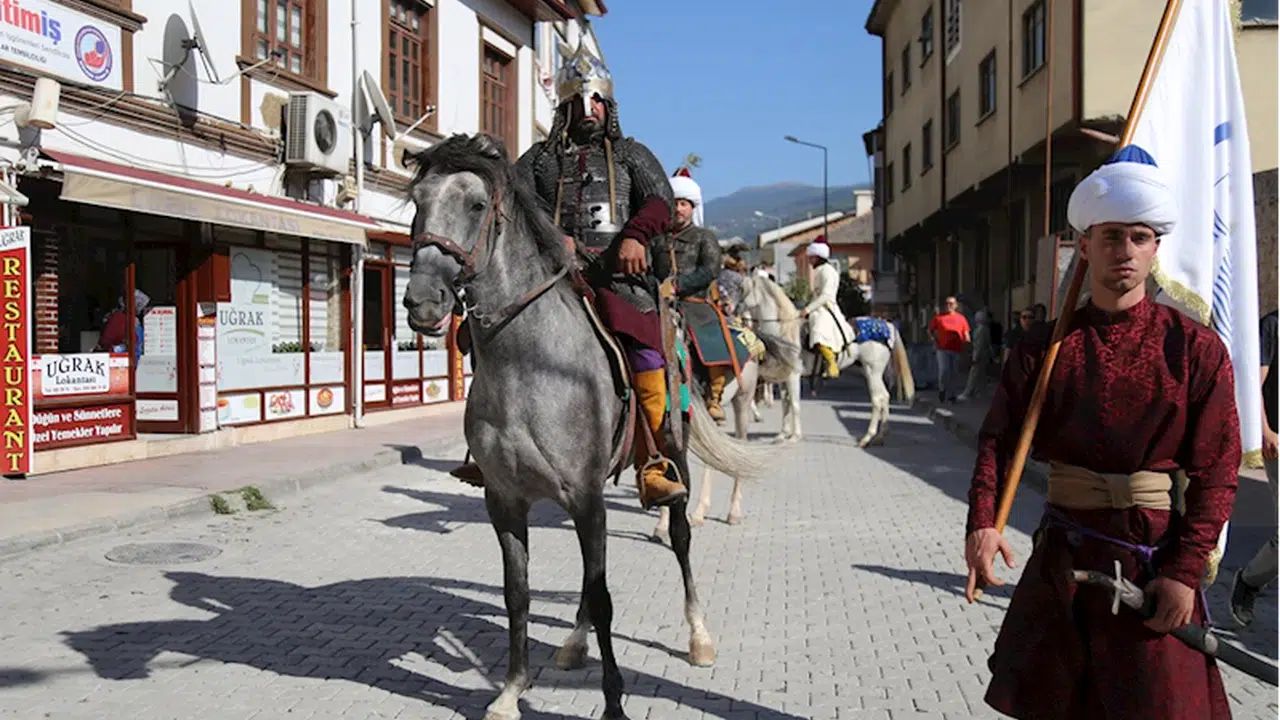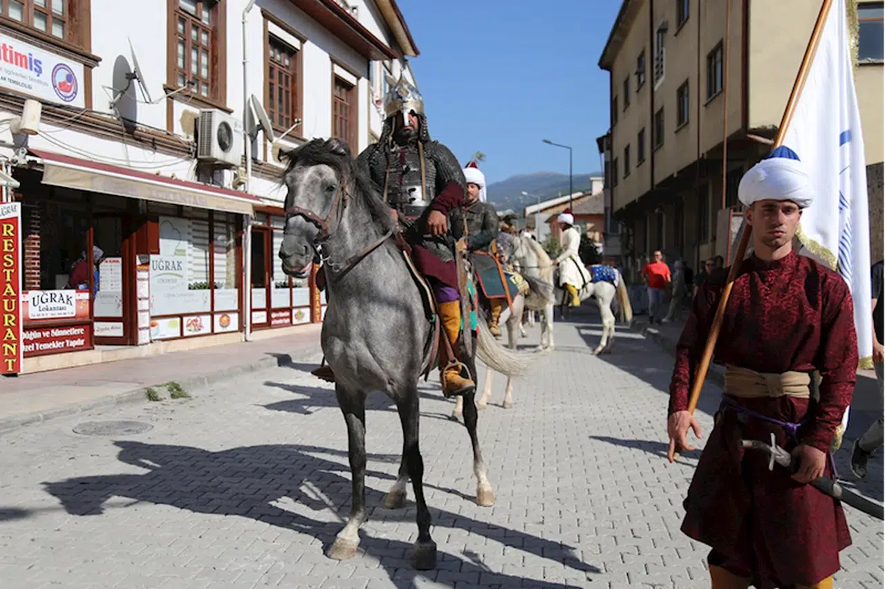 Türbeden başlayan kortej yürüyüşü Çorum Belediyesi Mehter Takımı öncülüğünde, protokol üyeleri, atlı okçular, sporcular ve vatandaşların katılımıyla yapıldı.