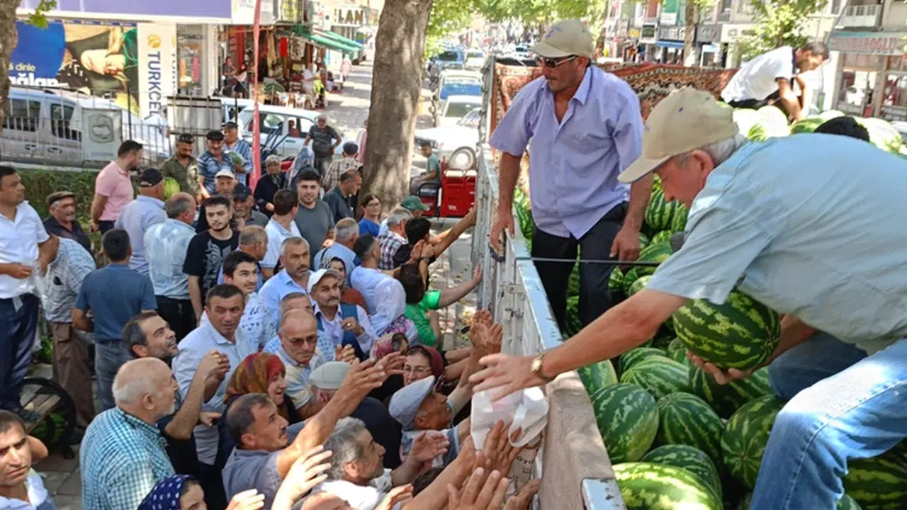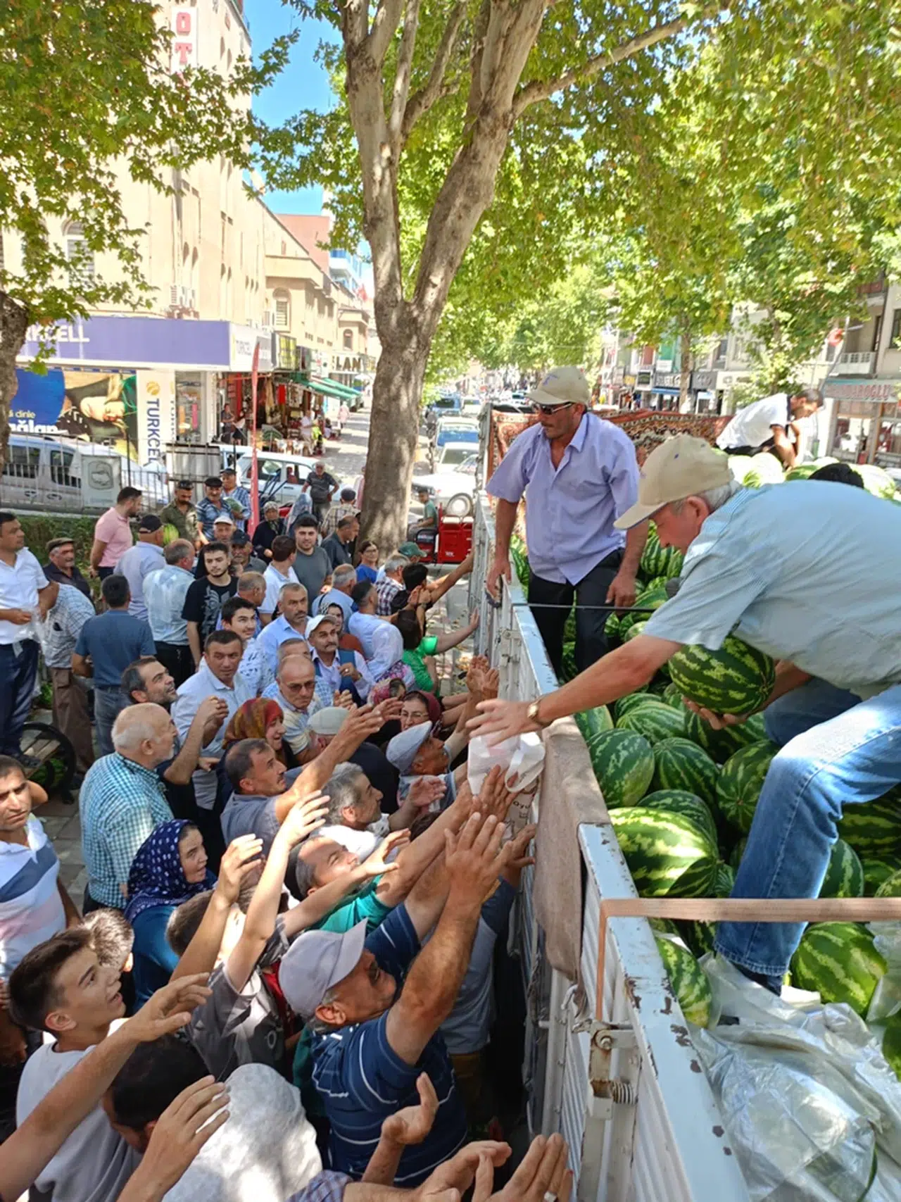 İlçede karpuz üreten Mehmet Kutsal, bir tır karpuzu belediyeden izin alarak şehir meydanında halka dağıttı.